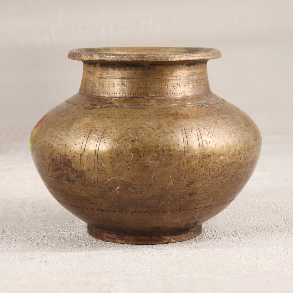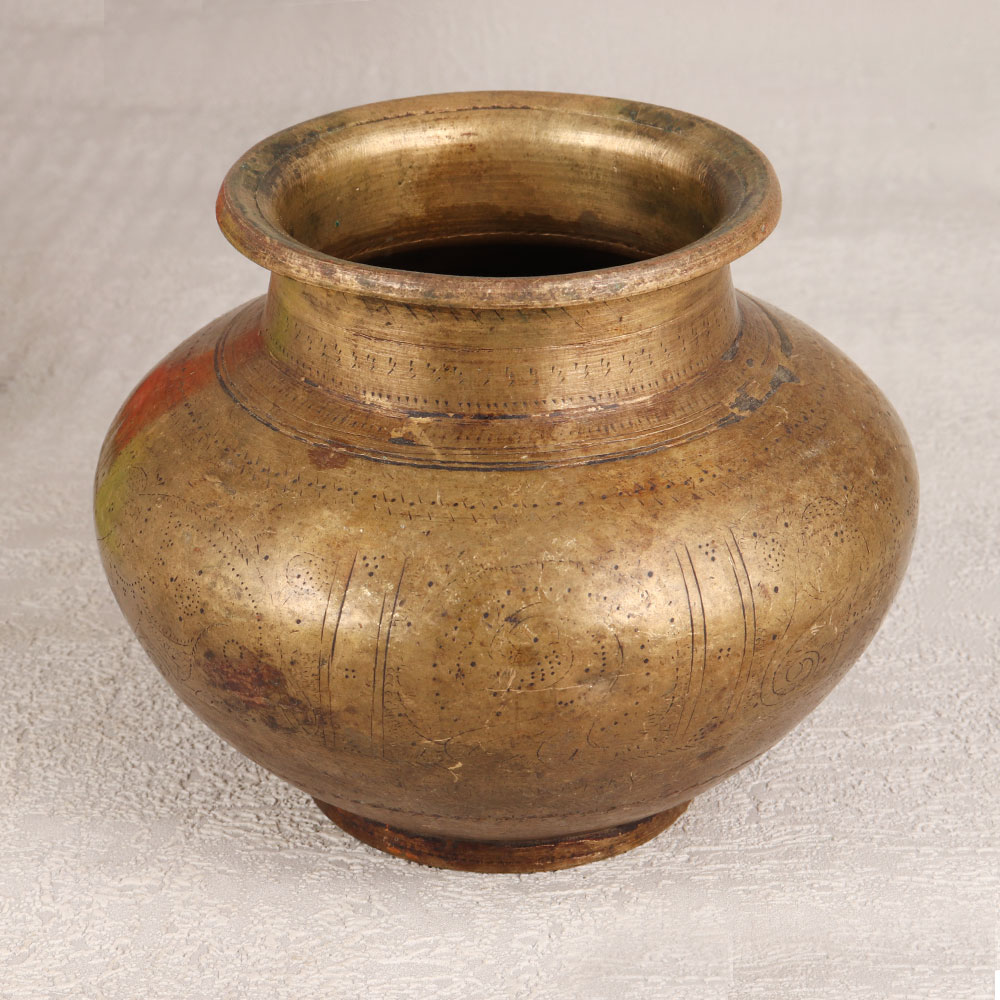 Immerse your sacred rituals in timeless elegance with this Vintage Brass Holy Water Pot that is a masterpiece handcrafted by talented Indian artisans from Gujarat. Made with precision and devotion, the pot boasts intricate carvings that weave a story of tradition and spirituality. The high-quality Brass construction, coupled with an antique brown finish, exudes an old-world charm that adds a touch of heritage to your prayer space. This versatile pot serves a dual purpose – perfect for holding holy water during prayers, havans, and auspicious occasions, while also doubling as an exquisite base for flower decorations. Its allure extends beyond religious ceremonies, as it transforms any space into a haven of aesthetic splendour. Whether adorning your home, office, restaurant, hotel, or cafe, this Brass pot becomes a captivating centerpiece, inviting admiration and conversation. An ideal addition to any vintage collection, this pot makes for a thoughtful and cherished gift for your family, friends or relatives on special, festive, or auspicious occasions. Elevate your spiritual practices and spaces with the grace and sophistication of this timeless artefact.