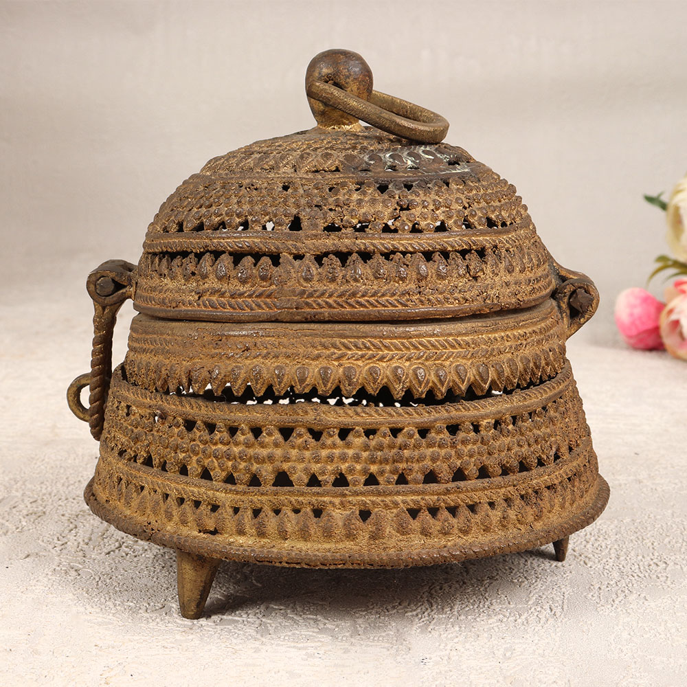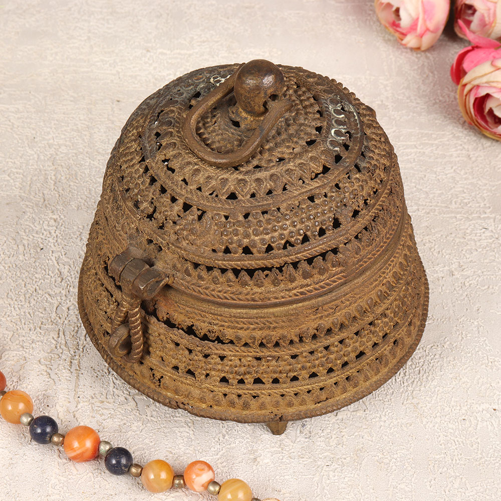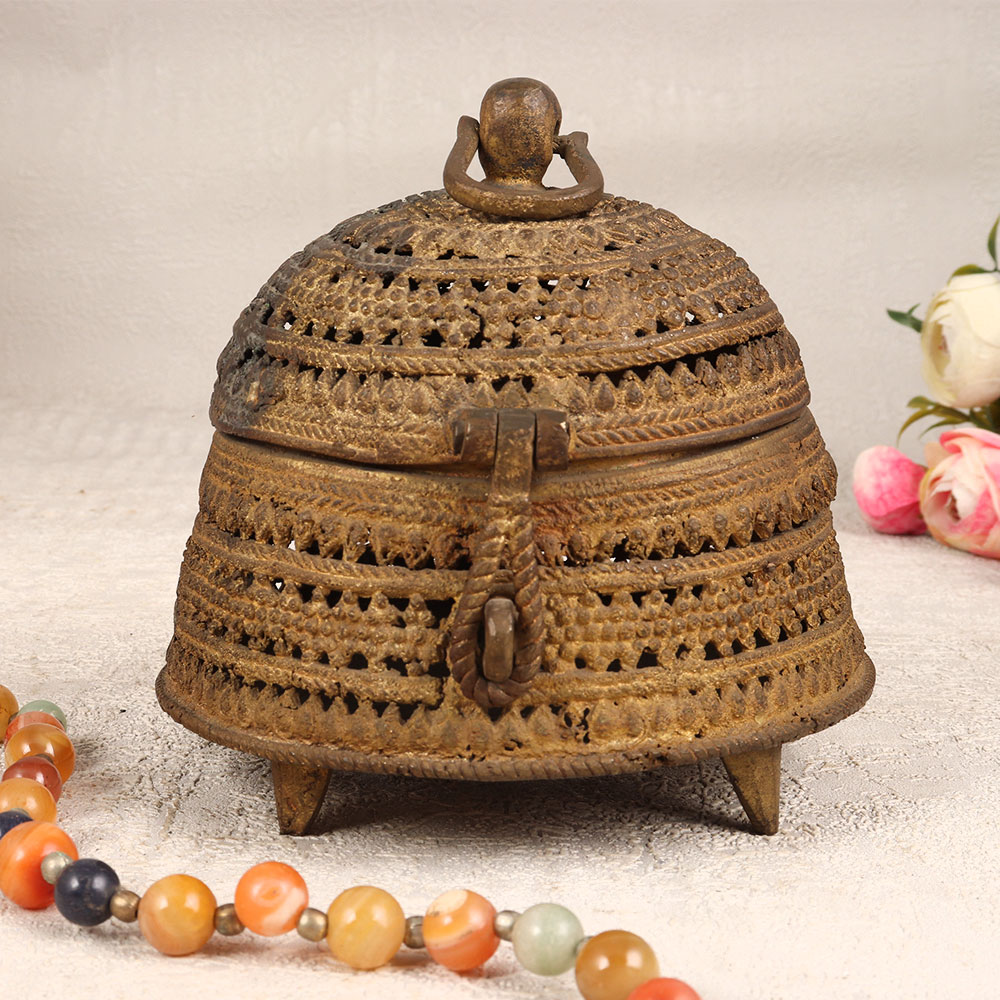 A Vintage Brass Jewelry Box which is a timeless piece of artistry that seamlessly combines functionality with elegance. This round-shaped box is adorned with intricate engravings that captures the essence of classic design. Crafted from high-quality brass in the traditional Odisha Art style by skilled Indian artisans, this handmade masterpiece radiates authenticity and cultural richness. The antique brown finish lends a touch of vintage charm, creating a stunning aesthetic that transcends time. Fitted with a secure latch, it provides a safe haven for your precious stones and jewelry, making it both a storage solution and a work of art. Its versatile design allows it to grace any setting, whether at home, office, restaurant, hotel, or cafe, adding a touch of sophistication to the surroundings. Ideal for collectors seeking to expand their vintage treasures, this brass jewelry box is a perfect addition. Moreover, it makes for a thoughtful and cherished gift for your family, friends or relatives on special, festive, or auspicious occasions, celebrating both craftsmanship and sentiment in one timeless package.