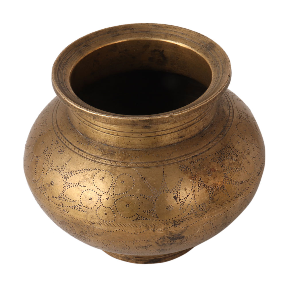 This traditional Indian lota pot is made of bronze. It has a dotted floral pattern that looks incredible. Bronze pots are considered auspicious in Hindu rituals. Saints use the pot to store the holy water of the river Ganga.