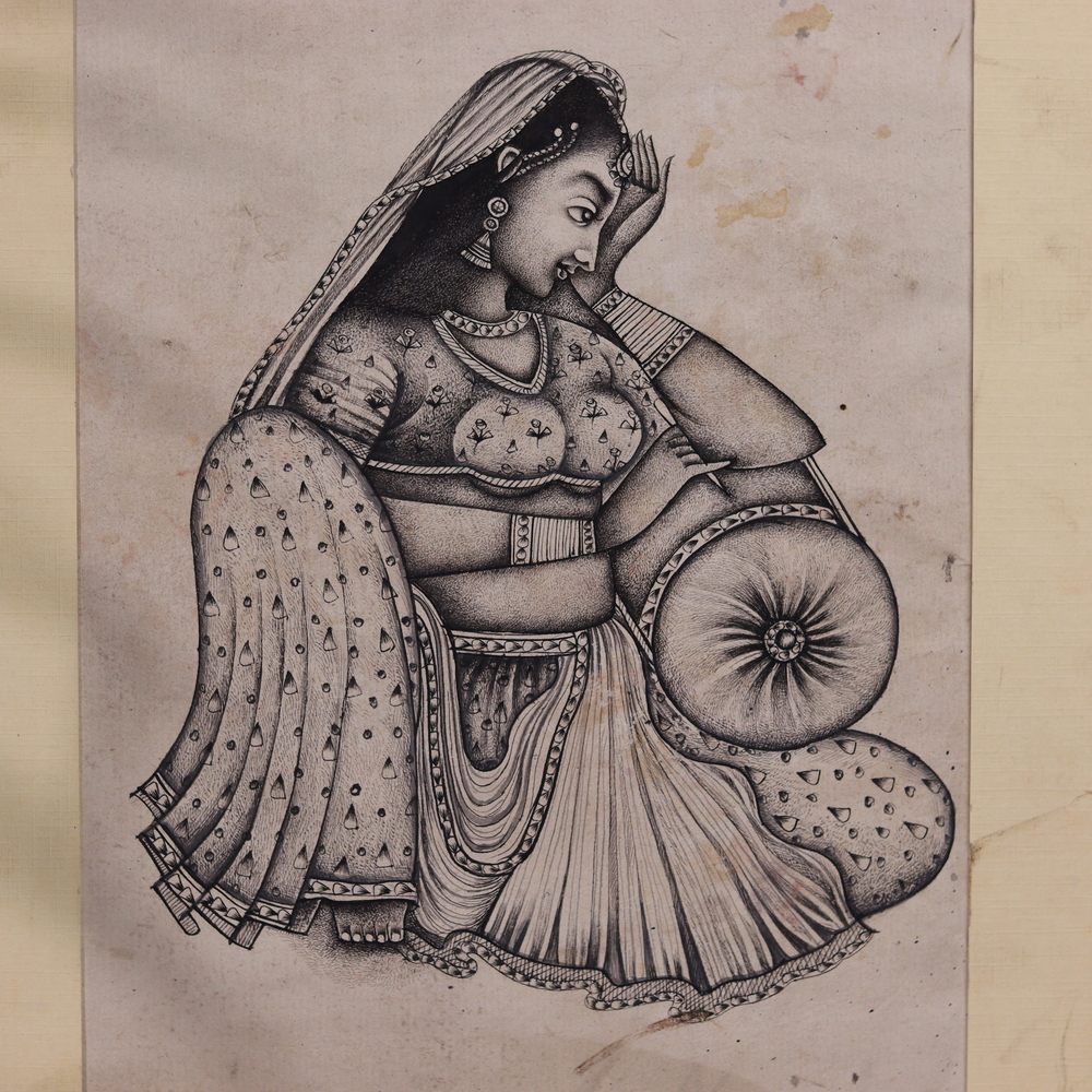 Discover the timeless allure of Indian culture with this stunning Vintage traditional Art Indian sitting lady painting. Crafted with meticulous attention to detail, this pencil drawing transports you to a bygone era, showcasing the enduring elegance and artistry of India's rich heritage. This painting is a true work of art, celebrating the beauty and craftsmanship of India's cultural legacy. The skilled artist has meticulously rendered every delicate fold of the woman's clothing, the intricate details of her jewelry, and the serene expression on her face. Each stroke of the pencil brings this vintage scene to life, inviting you to immerse yourself in the timeless charm of traditional Indian art. Whether you're a seasoned art collector or simply appreciate the rich cultural heritage of India, this Vintage traditional Art Indian sitting lady painting is a must-have addition to your home or office. Hang it in a prominent spot and let it transport you to a world of elegance, tradition, and artistic excellence.