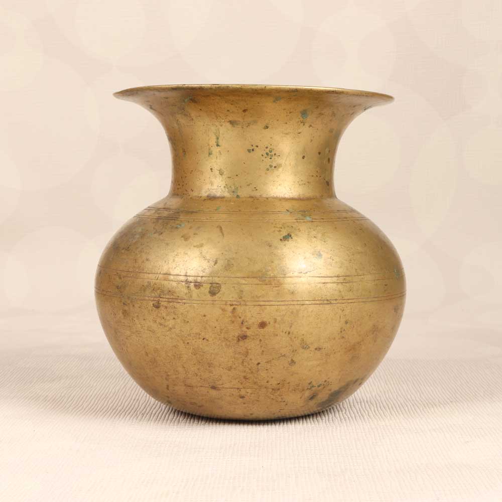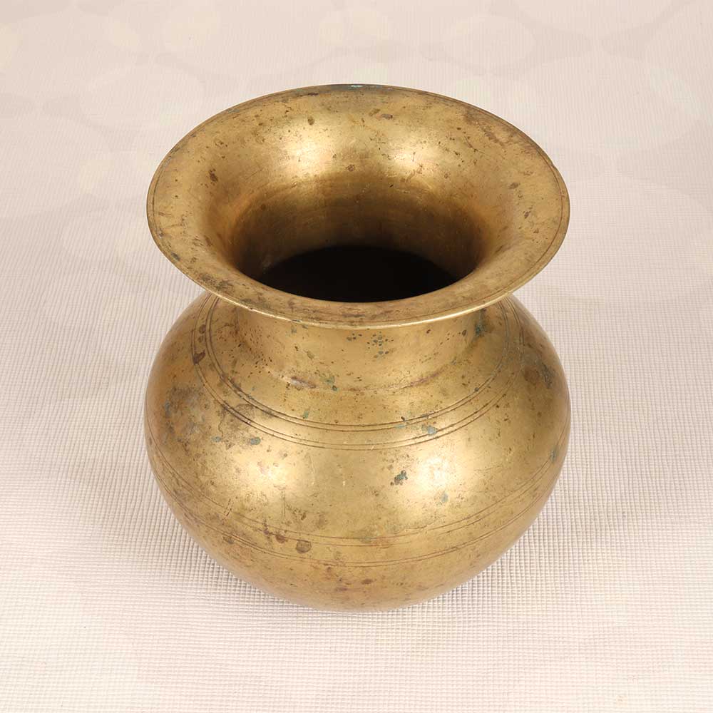 Add an authentic touch of tradition to your home with this vintage brass holy water pot. Expertly handcrafted in the South Indian Art style, it's both captivating decor and an essential ritual vessel. During important ceremonies, this pot beautifully holds and pours holy water for blessings. The elegant design provides a graceful way to share holy water. When not used in rituals, it lends a traditional presence to shelves and countertops. Fill with fresh flowers for an inspired spiritual decor accent. Connect with ancient practices and craftsmanship. This brass holy water pot infuses daily worship and home decor with devotion and meaning. Add this special vessel to your home.