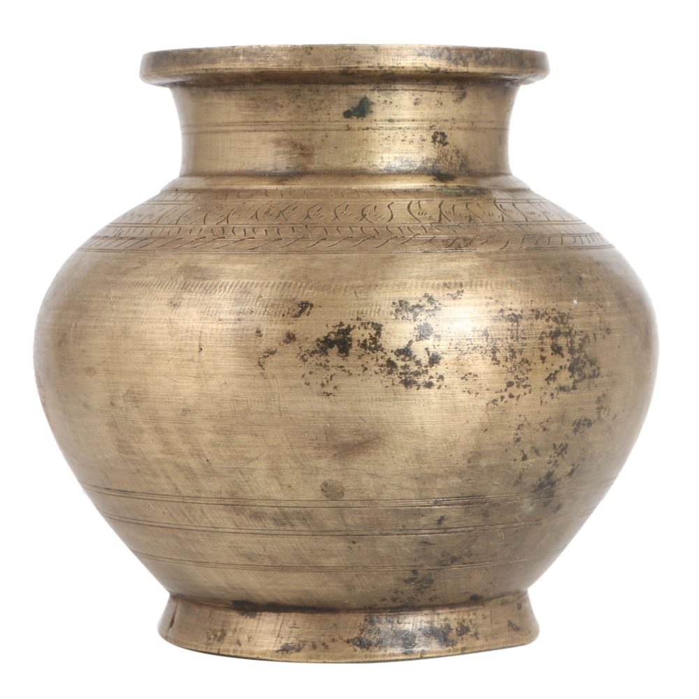 This traditional Kalash or holy water pot is carved from brass alloy. It has been engraved with patterns. Use this vintage Kalash as a Purna Kalash in Hindu rituals. A Purna Kalash is a Kalash filled with water, rice or gold coins. Mango leaves are placed on top so that they touch the water, and a coconut is placed on the top facing the sun. It is used in rituals and auspicious events. Beautify your home with this vintage style Kalash.