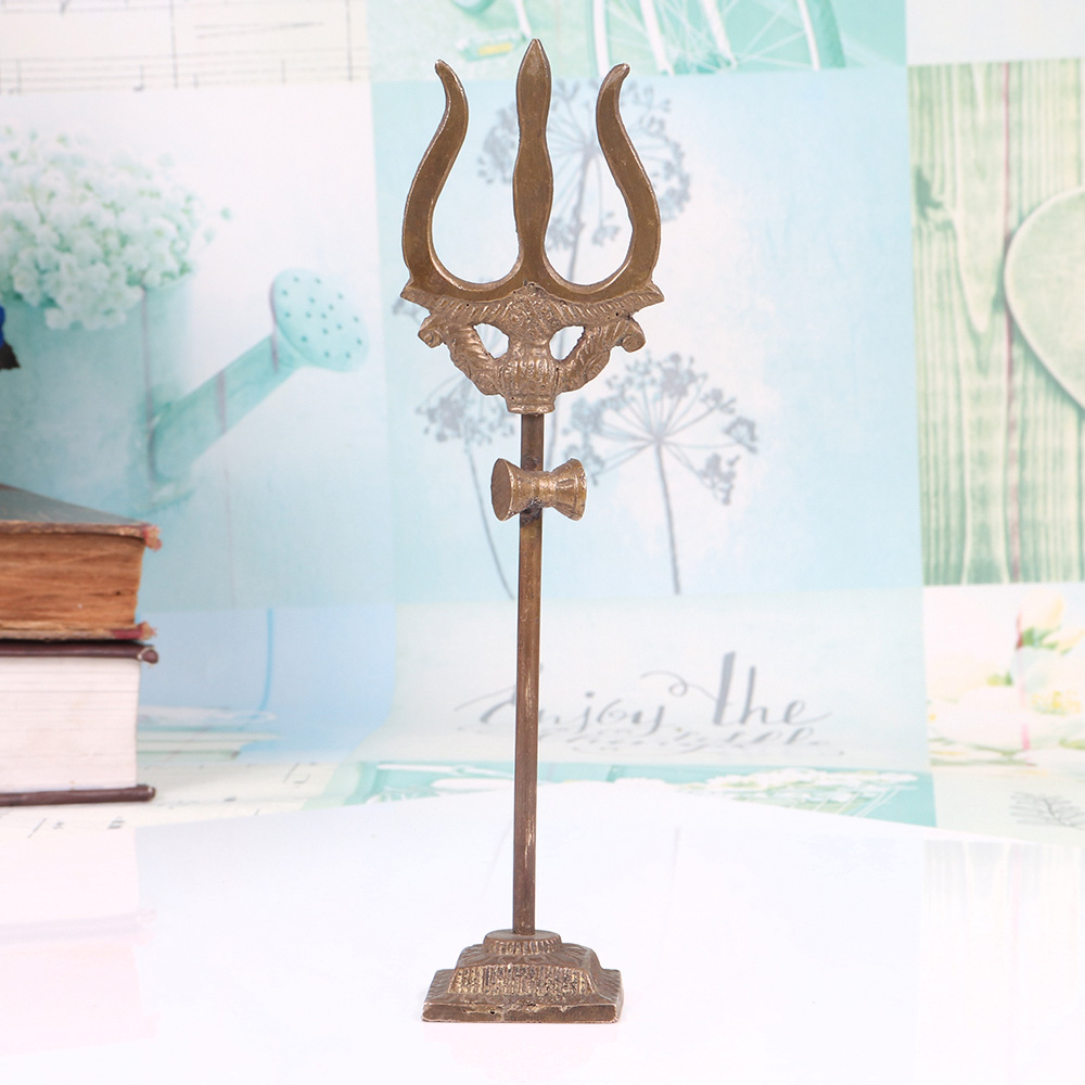 Elevate your spiritual practice with the commanding presence of this vintage brass Lord Shiva Trishul (Trident). Meticulously crafted with an eye for detail, this stunning ritual object is a masterpiece of traditional Hindu artistry that will infuse your home with sacred energy and divine blessings. As the focal point of your meditation or prayer room, this magnificent Trishul will inspire your spiritual journey and connect you to the profound wisdom and blessings of the Hindu pantheon. Whether you are a devoted practitioner or simply appreciate fine craftsmanship and the beauty of ancient traditions, this Trishul is a stunning work of art that will captivate all who behold it. Invite the protection and grace of Lord Shiva into your home and let this sacred object elevate your spiritual practice to new heights.