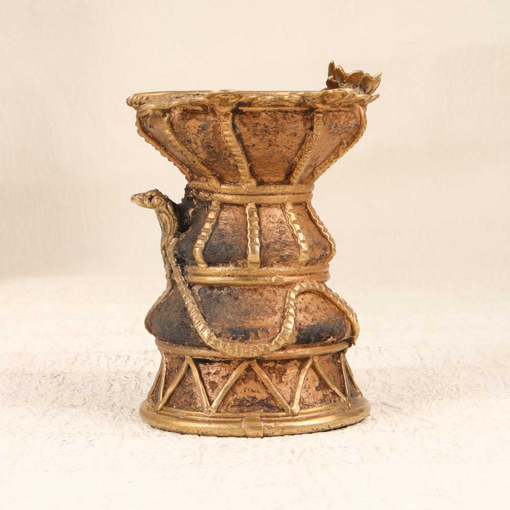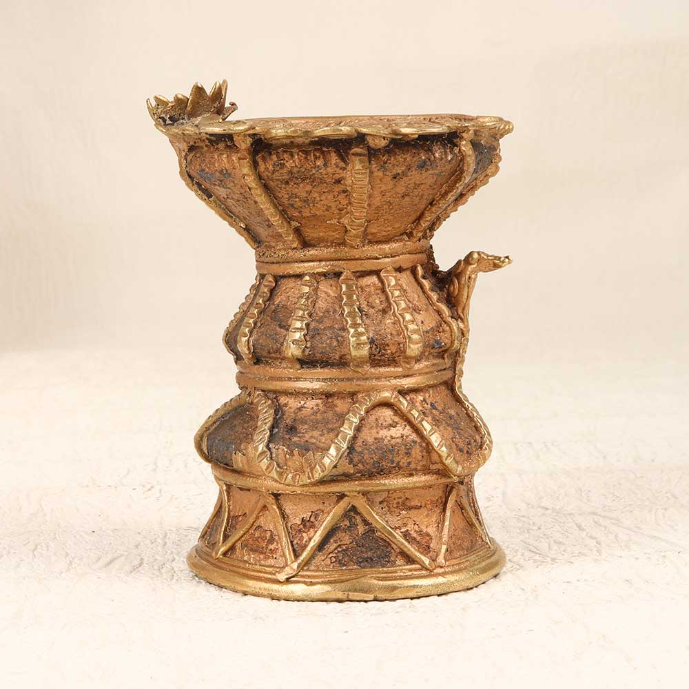 Step back in time with this antique-style engraved brass oil lamp. Featuring an intricately embellished cobra design, this lamp brings exotic flair to any space. Revel in the warm, welcoming glow of antique lamp light. The soft ambience creates a relaxed atmosphere, perfect for intimate evenings at home. This hand-engraved lamp adds an exotic, old-world accent to your living room, bedroom or patio. Fueled by simple kerosene oil, the flickering flame sets the mood. For decor lovers looking to add vintage character to their home, this tribal cobra engraved brass lamp delivers exotic elegance. The intricately embellished design and old-fashioned lighting transform your space into a cozy, charming retreat.