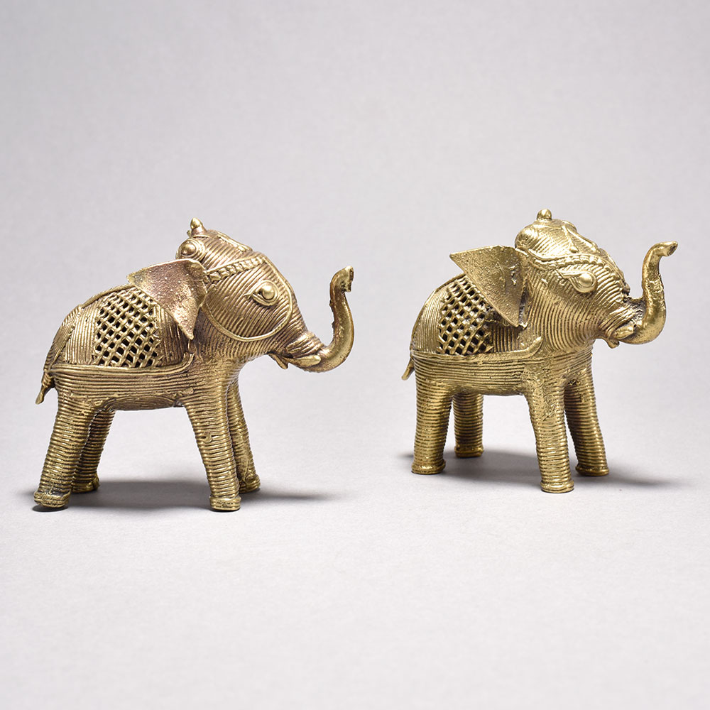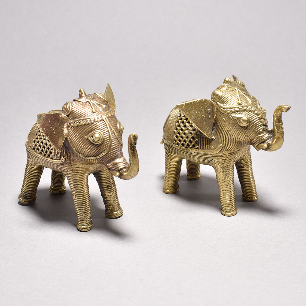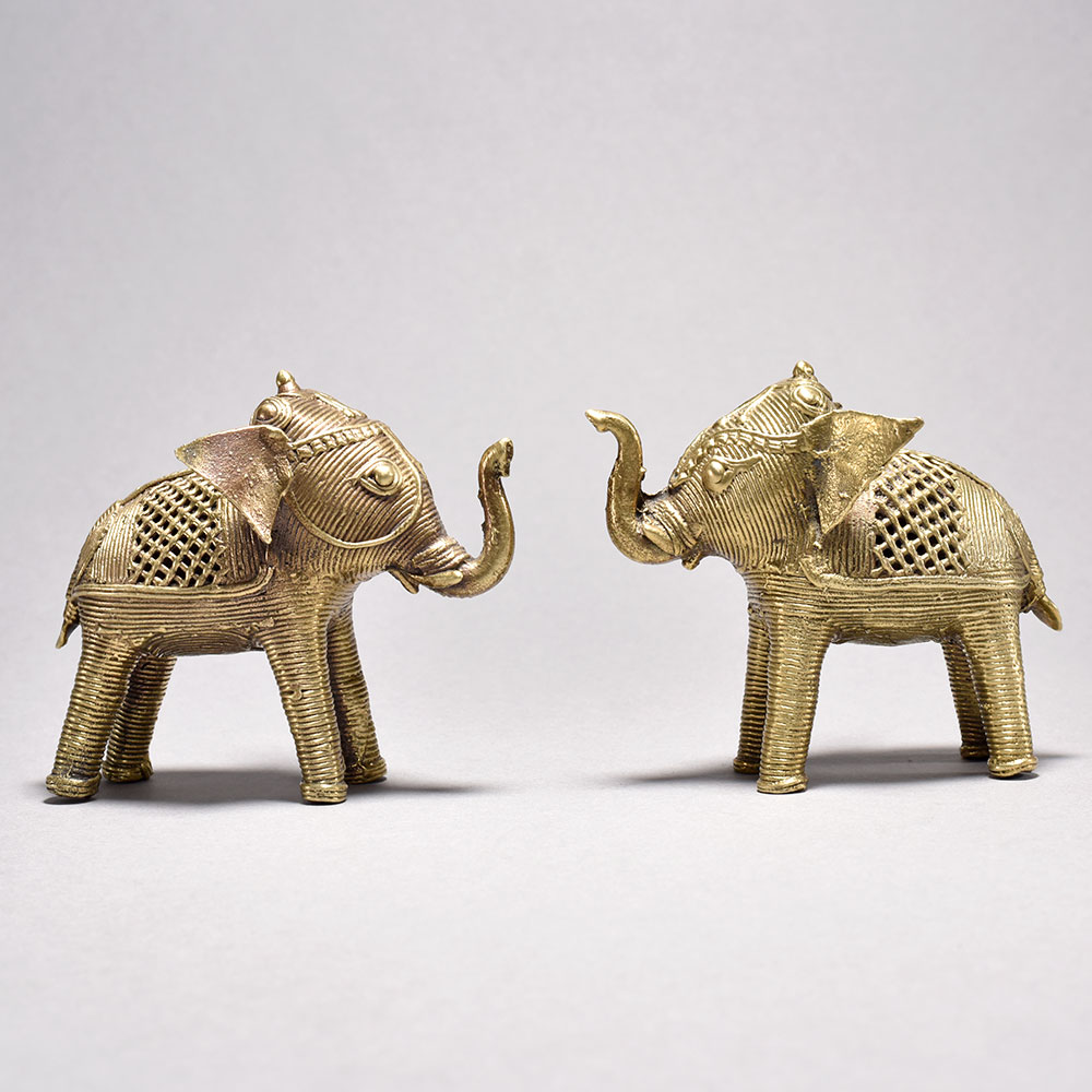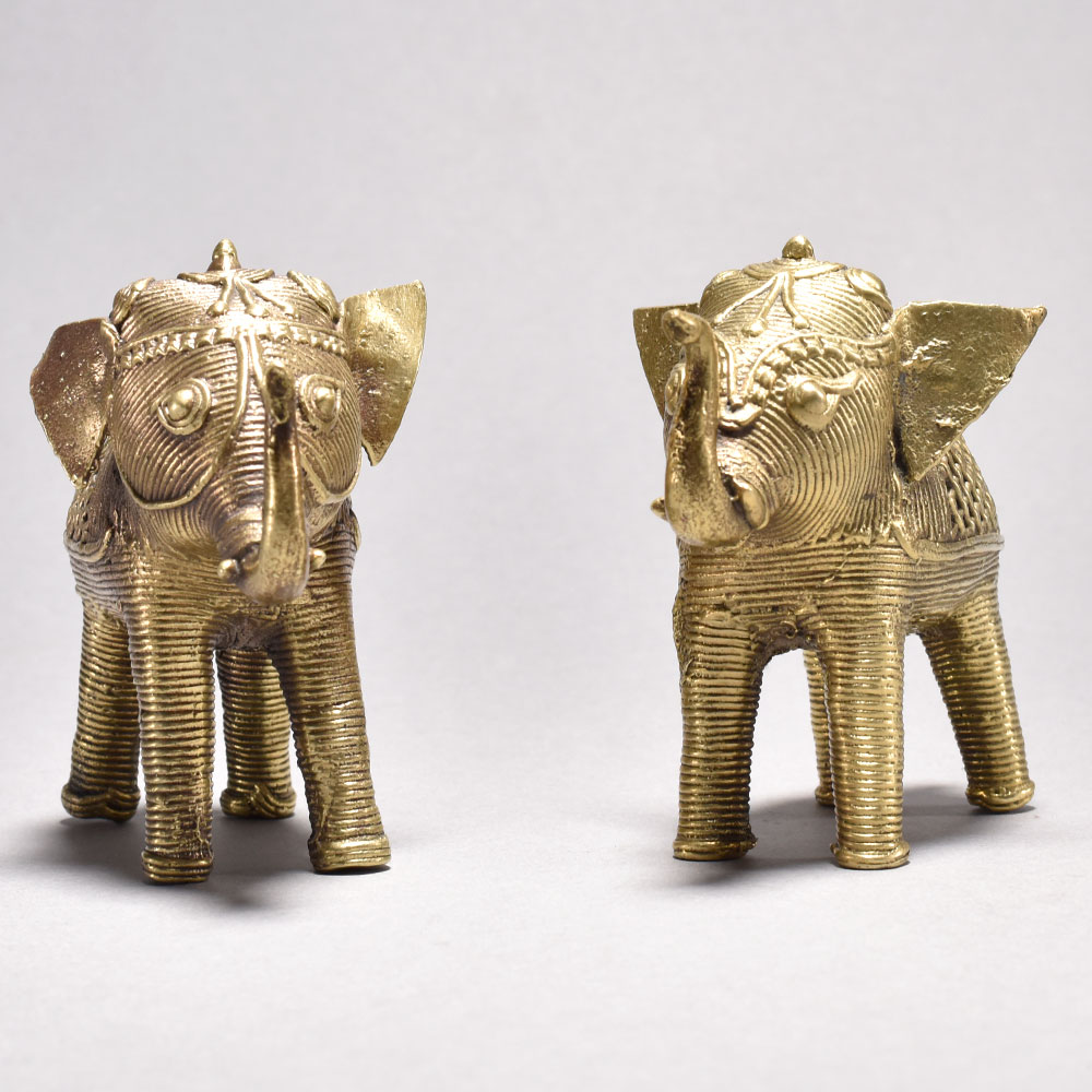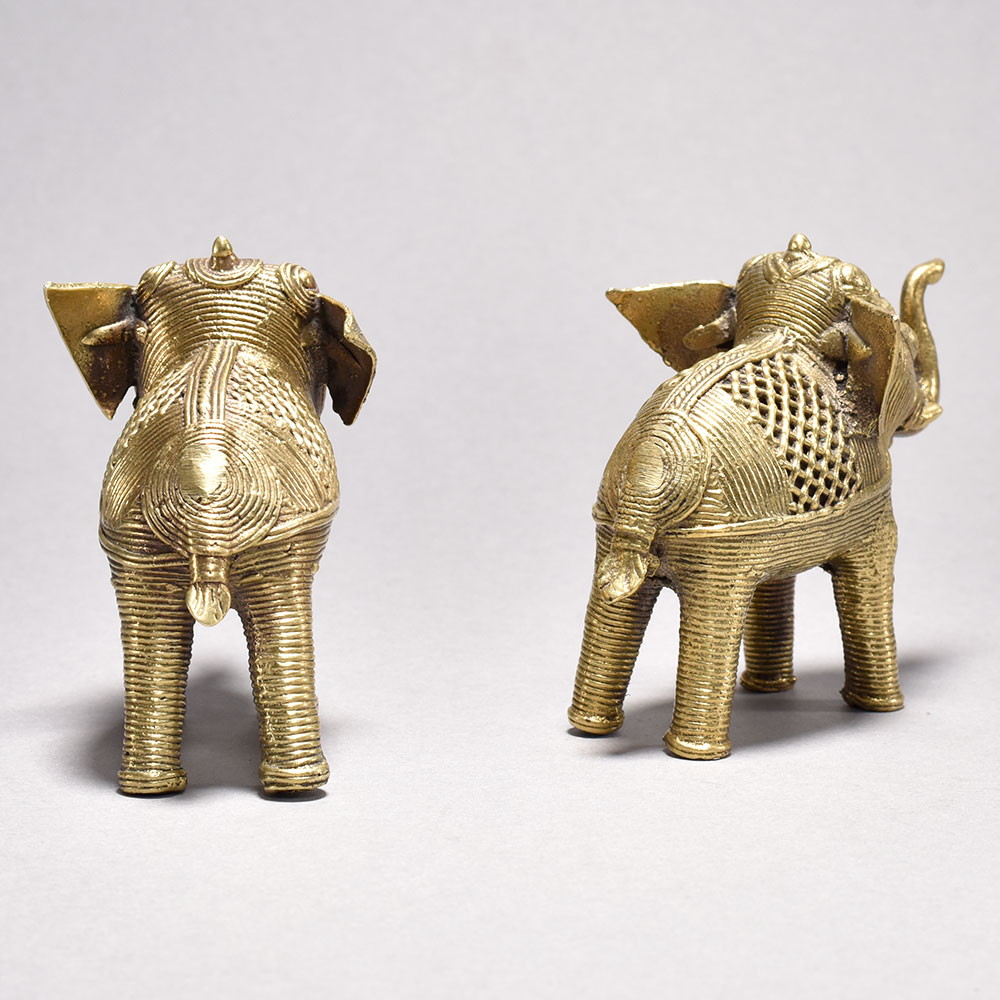 Discover the captivating beauty of tribal artistry with this stunning pair of metal elephant figurines.These magnificent tribal art elephants aren't just decorative pieces - they carry deep cultural significance that will imbue your space with an air of ethnic elegance. Whether displayed individually or together, these charming figurines make a striking statement and an unforgettable gift. Bring the timeless beauty of Orissa artistry into your home today. Meticulously handcrafted from metal using the ancient cast process This timeless piece is handcrafted by skilled artisans using time-honored techniques, ensuring each creation is truly one of a kind. Its versatile design makes it suitable for living rooms, bedrooms, offices, or meditation spaces, bringing a sense of heritage and style wherever it is displayed. This timeless piece is handcrafted by skilled artisans using time-honored techniques, ensuring each creation is truly one of a kind. Its versatile design makes it suitable for living rooms, bedrooms, offices, or meditation spaces, bringing a sense of heritage and style wherever it is displayed.