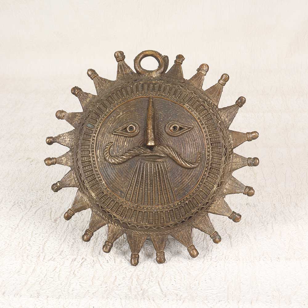 Bask in the glow of ancient tribal sun worship with this vintage brass sun god wall plaque. Expertly cast in solid brass with an aged patina, intricate tribal patterns swirl around a prominent circular sun motif. This is decor fit for a deity. Bring spiritual essence into your home with this one-of-a-kind tribal sun plaque. It's an exotic statement piece that evokes ancient rituals and pays tribute to solar deities. The aged brass finish gives it an authentic, well-traveled appeal. Hang above a mantle, in an entryway, or anywhere you want a daily blessing from the sun god himself. For boho chic style with an anthropological edge, this brass wall plaque is sure to enlighten your space.