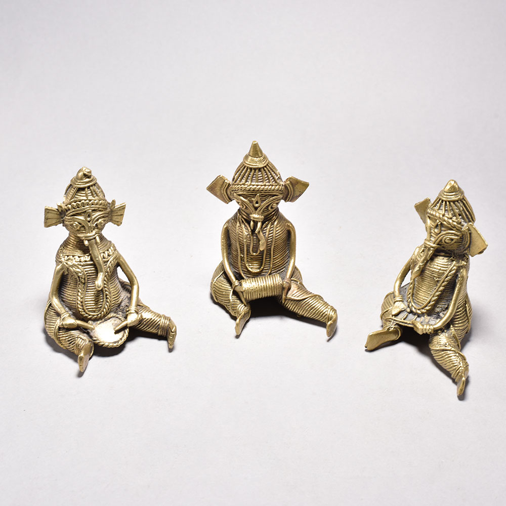 Elevate your home with the mesmerizing Tribal Art Lord Ganesha Set of 3.Bring the enchanting spirit of India into your space with this captivating trio of Lord Ganesha figurines. Crafted with exquisite attention to detail, each deity is uniquely depicted playing a different musical instrument, creating a harmonious symphony that will transport you to the heart of tribal culture. Display this breathtaking set as a stunning centerpiece or give it as a meaningful gift that celebrates the divine and the artistry of India's heritage. This Tribal Art Lord Ganesha Set is perfect for those who appreciate the beauty of traditional craftsmanship and seek to infuse their home with the sacred and the sublime. Let these three deities grace your space, filling it with the joyful melodies of India's timeless traditions. Meticulously handcrafted from fine Orissa metal This timeless piece is handcrafted by skilled artisans using time-honored techniques, ensuring each creation is truly one of a kind. Its versatile design makes it suitable for living rooms, bedrooms, offices, or meditation spaces, bringing a sense of heritage and style wherever it is displayed.