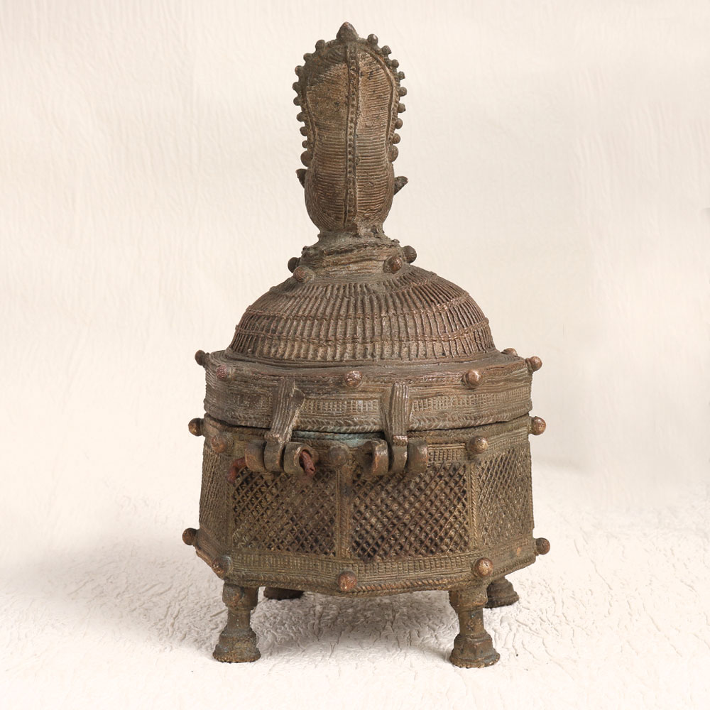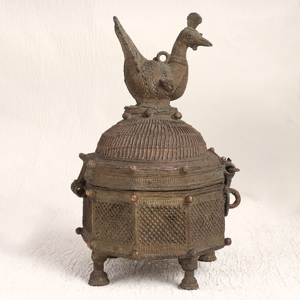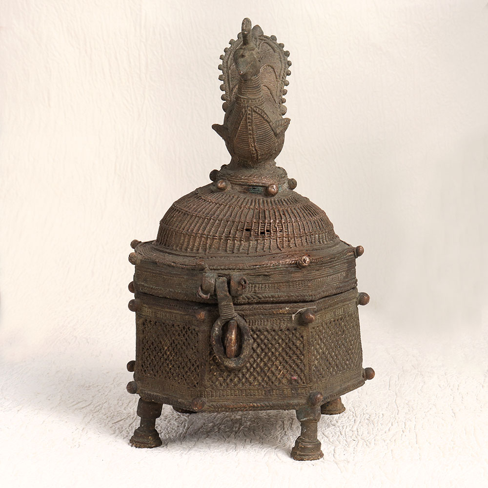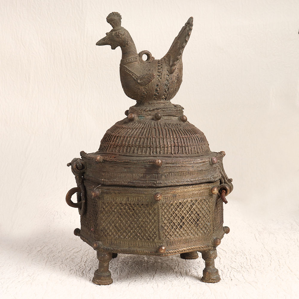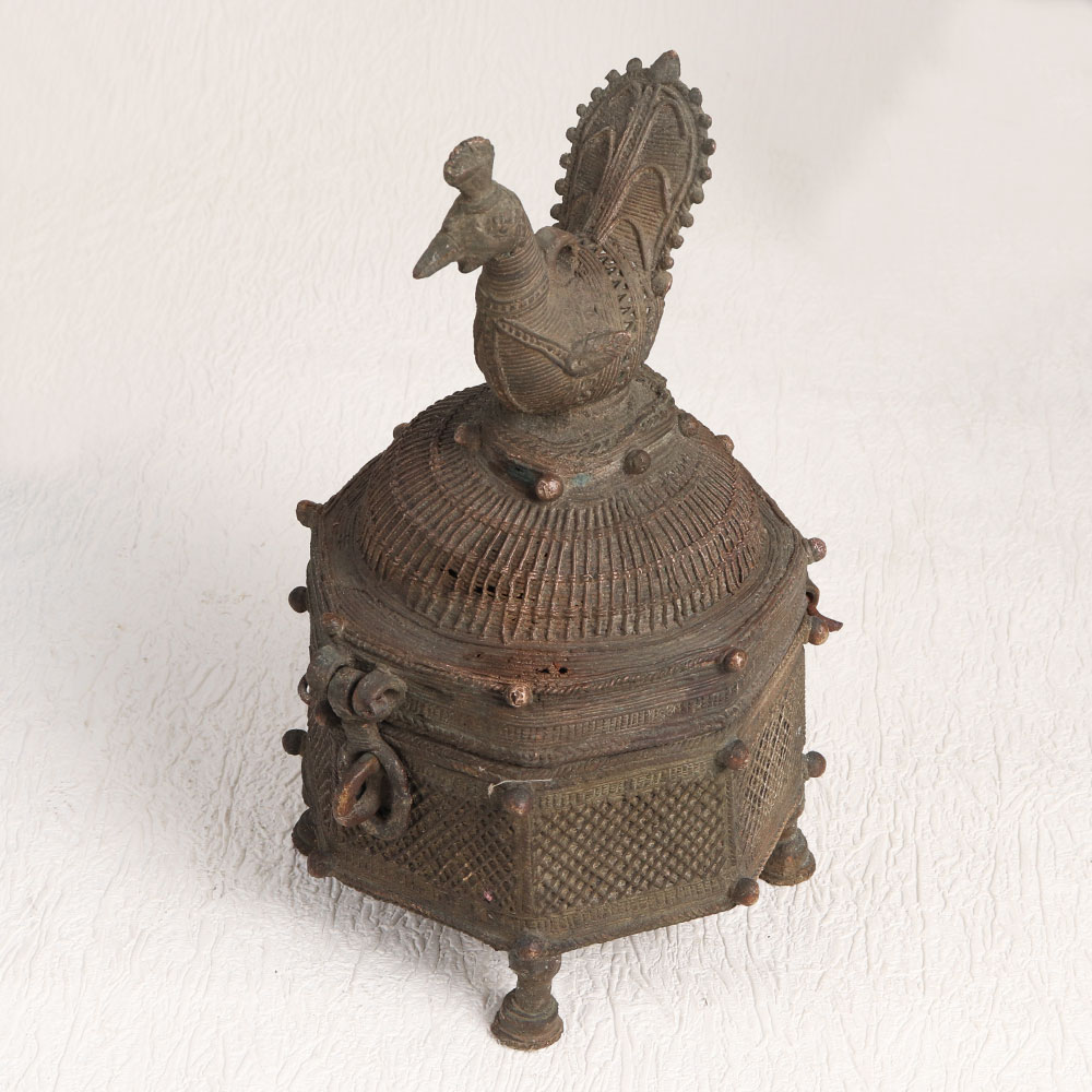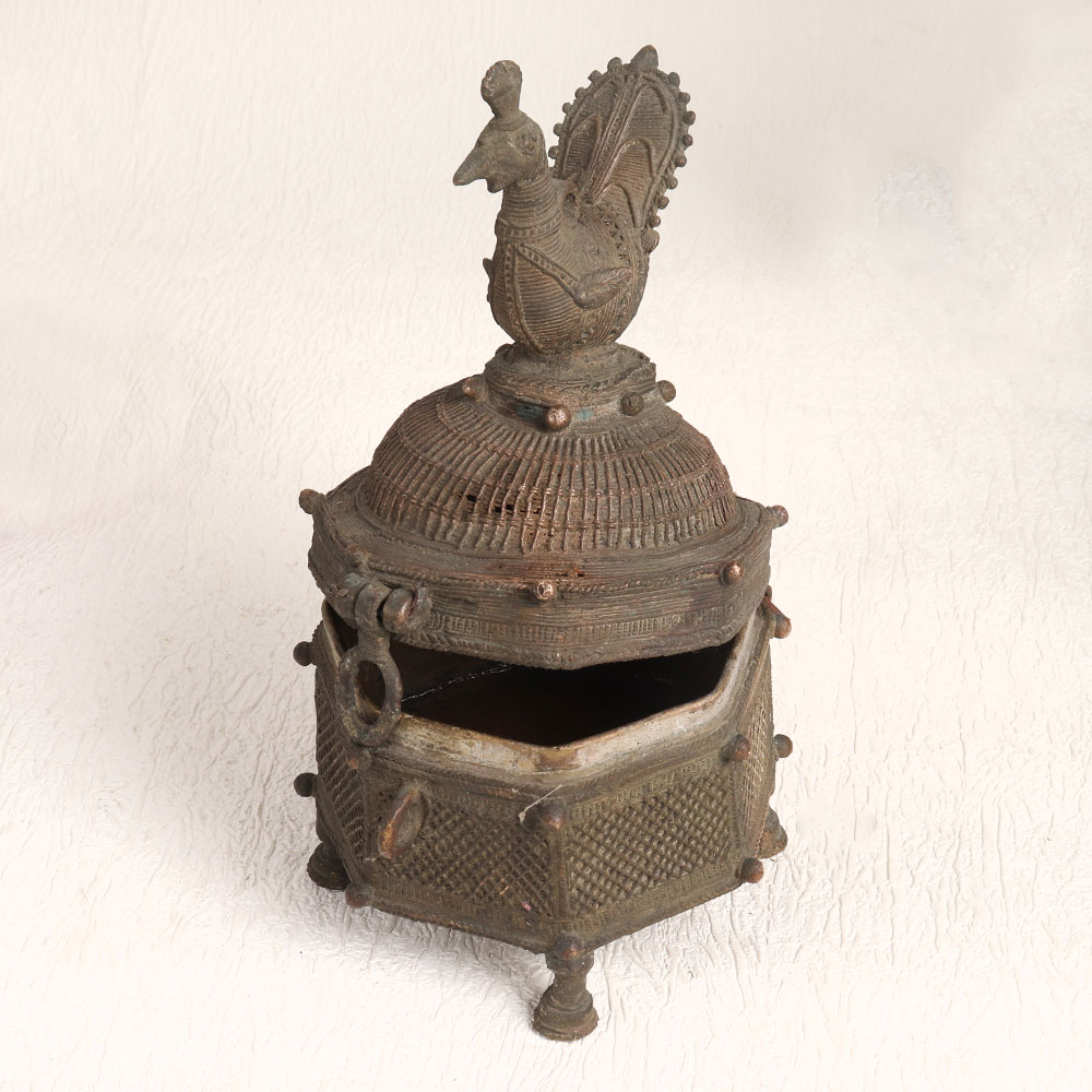 Enhance your decor with the charm of this Vintage Brass Box featuring a stunning hand-carved peacock on its lid. Crafted with meticulous precision by skilled artisans in the timeless tradition of Tribal Art, this brass box embodies the essence of heritage craftsmanship. The box boasts an antique dark finish, adding a touch of rustic elegance to any space. Its versatility knows no bounds, making it a perfect addition to your home, office, restaurant, hotel, cafe, or shop. Whether used to store treasured trinkets or as a standalone decorative piece, it effortlessly enhances the ambiance of any setting. This brass box is more than just a decorative accent, it's a piece of art that can be proudly displayed in your vintage collection or showcased at exhibitions. It also makes for a thoughtful gift, ideal for special, festive, or auspicious occasions, symbolizing the timeless beauty of handmade craftsmanship. Embrace the allure of the past with this Vintage Brass Box, a true testament to the artistry of bygone eras.