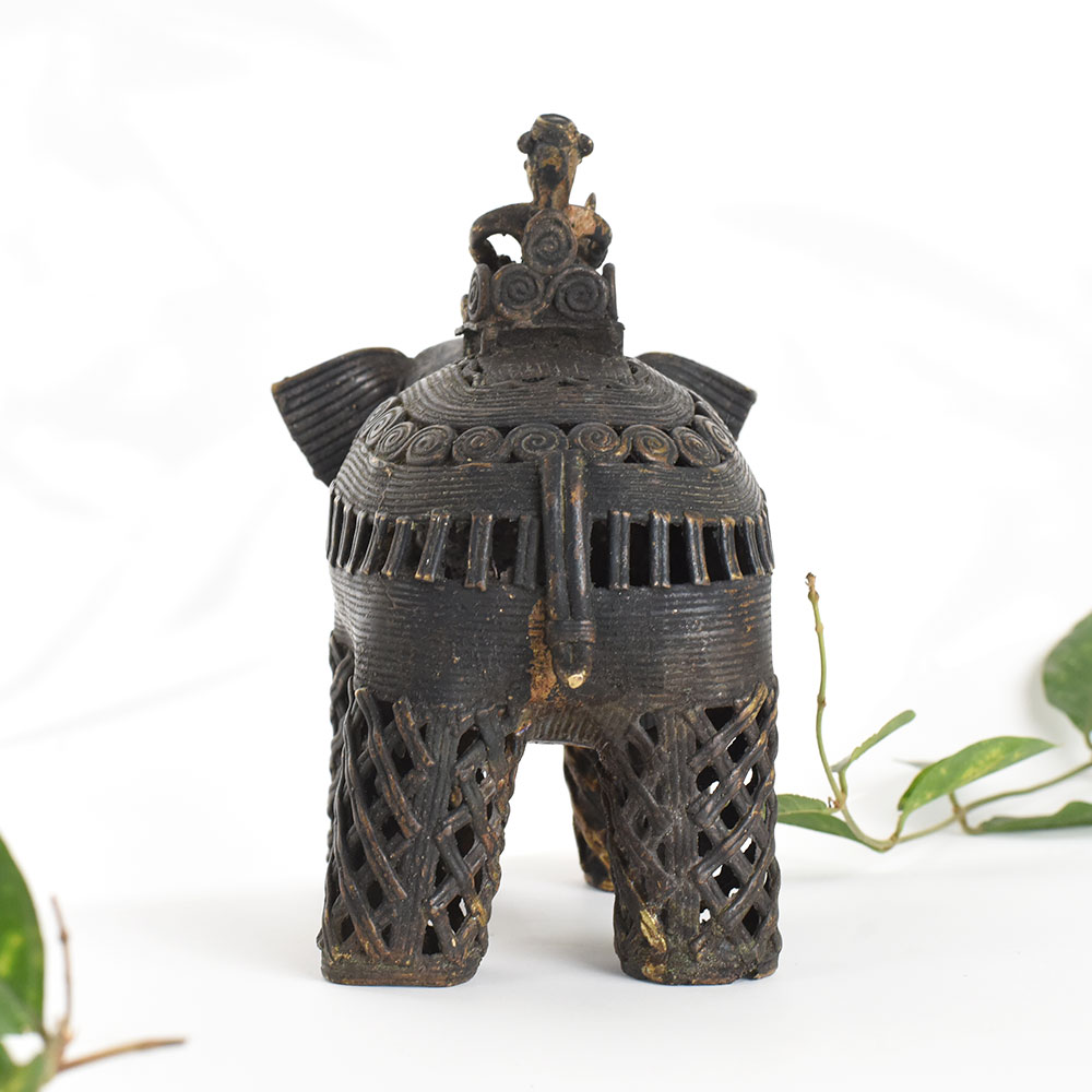 Celebrate the artistry of tribal metalwork with this elephant rider sculpture. Crafted using the ancient lost wax casting technique, the piece features an intricately detailed elephant with a rider sitting atop, carrying a sense of movement and storytelling. The lattice work on the elephant’s body and the expressive features of the rider reflect the skill and creativity of the artisan. Place this sculpture on a bookshelf, console, or mantel to add a touch of cultural heritage and conversation starting charm. The rustic finish adds depth and character, making it a striking standalone piece or part of a curated collection. Each sculpture is hand cast, ensuring that no two are exactly alike.