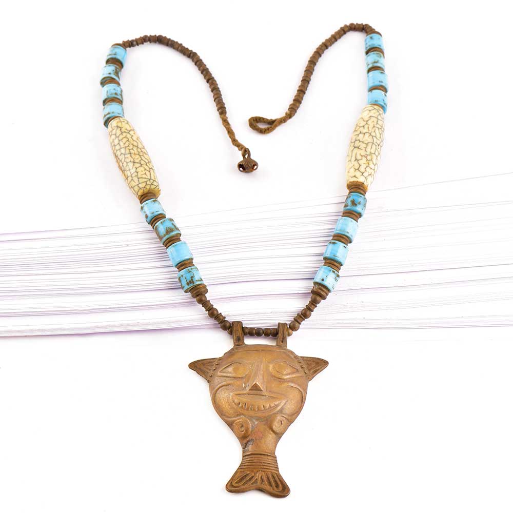 The necklace uses high-quality glass and resin beads inspired by traditional tribal color palettes.