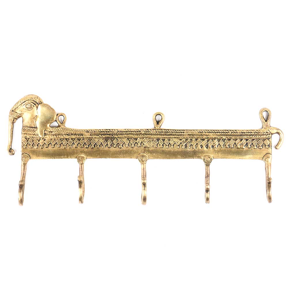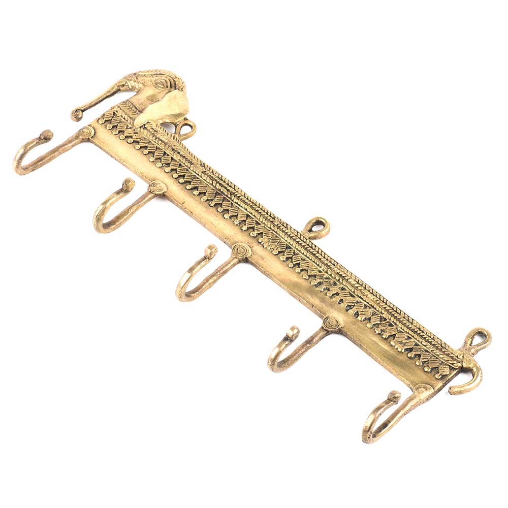 Elegant Elongated 5 Brass Hooks with Elephants Motifs Displaying the Intricate Craftsmanship of the Artisan. these can be Nailed on Any Surface for Hanging Your Hats, Umbrellas, Light Coats, Caps, Scarves, and Other Such Pieces in Your Home or Work Place.