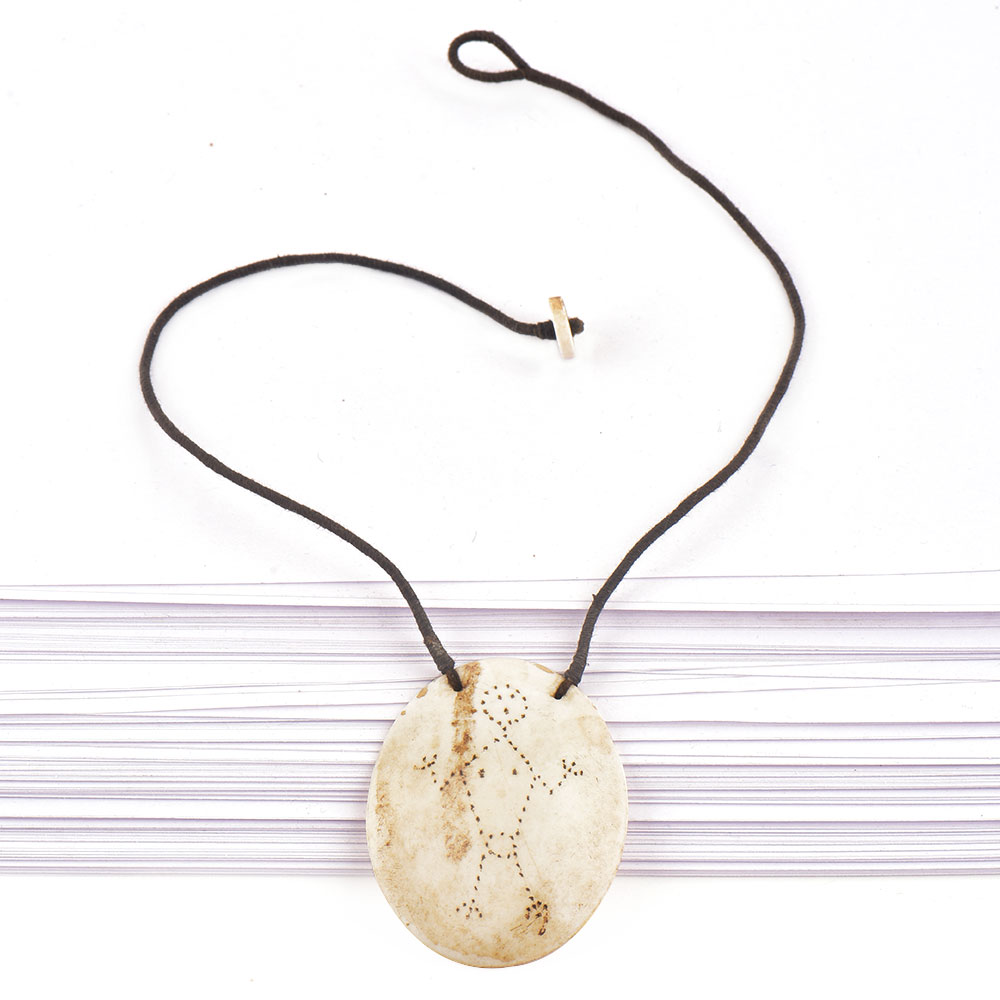 This single engraved tribal figure design on seashell pendant is made by the local artisans of India .The jewelry is made of a number of shell or two to three whole shells that are drilled with adjustable black thread which makes it easy to wear and fit.