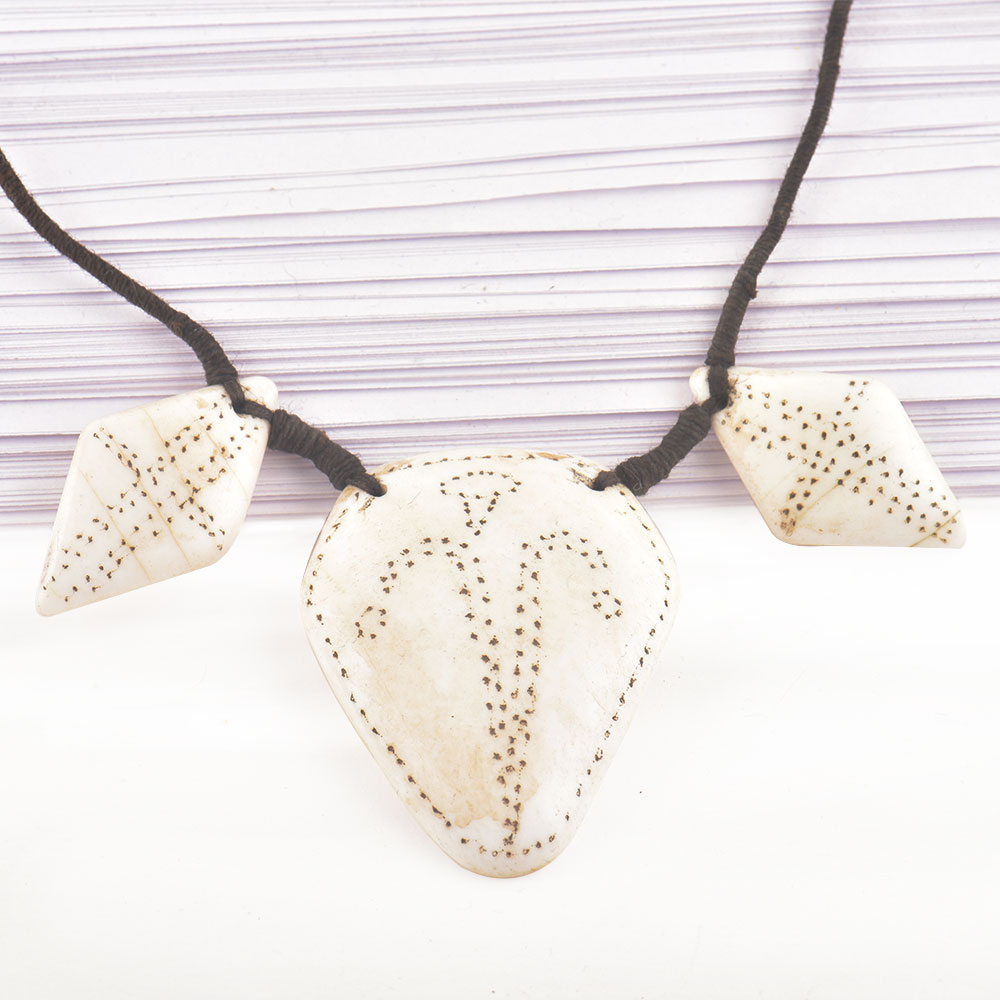 This tribal white seashell pendant is made from seashells that has a figures engraved on it by the local artisans of India .The jewelry is made of a number of shell or two to three whole shells that are drilled with adjustable black thread which makes it easy to wear and fit.