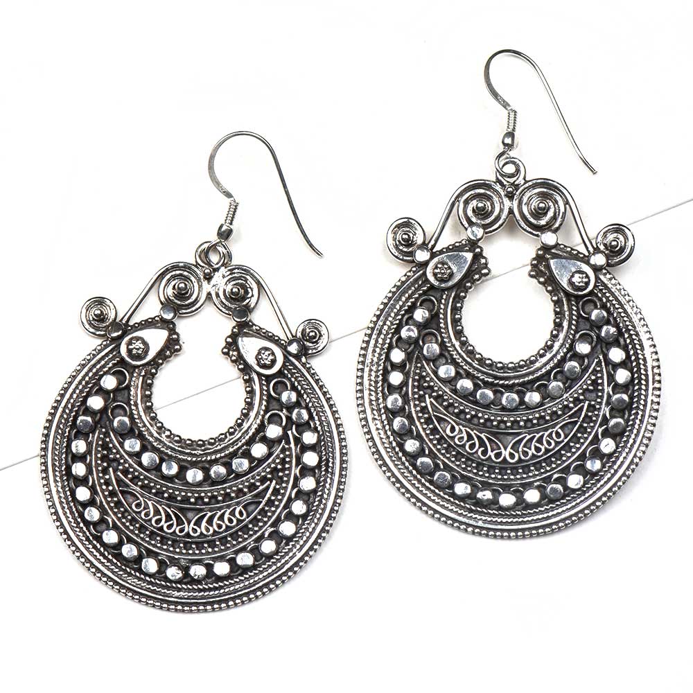 Tribal Hinged 92.5 Sterling silver earrings with filigree work round balls and traditional pattern in hand bali design. These dangle earrings can be paired with you suits, lehengas, saris and other traditional outfits. Gift it to your near and dear ones on diwali, birthday, valentine or on wedding day.