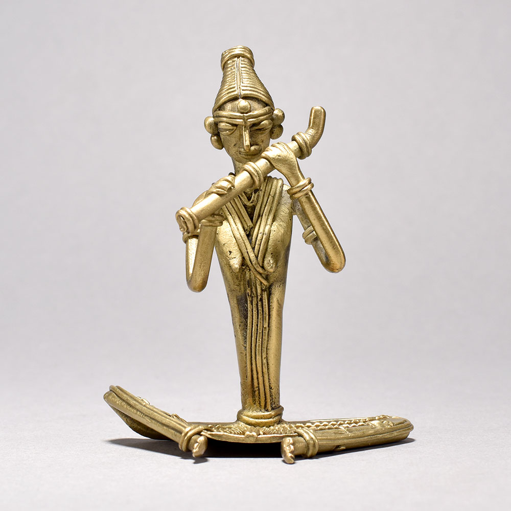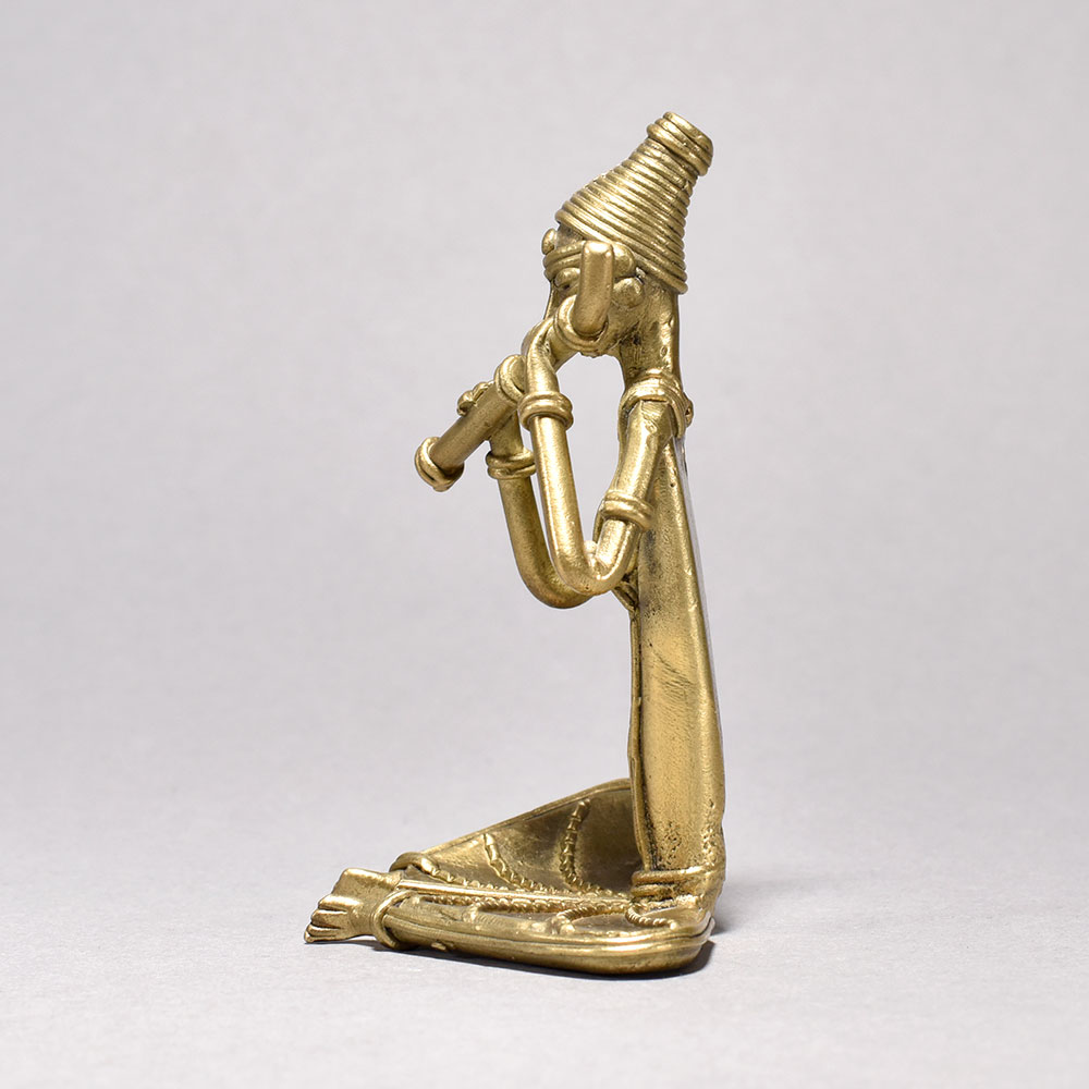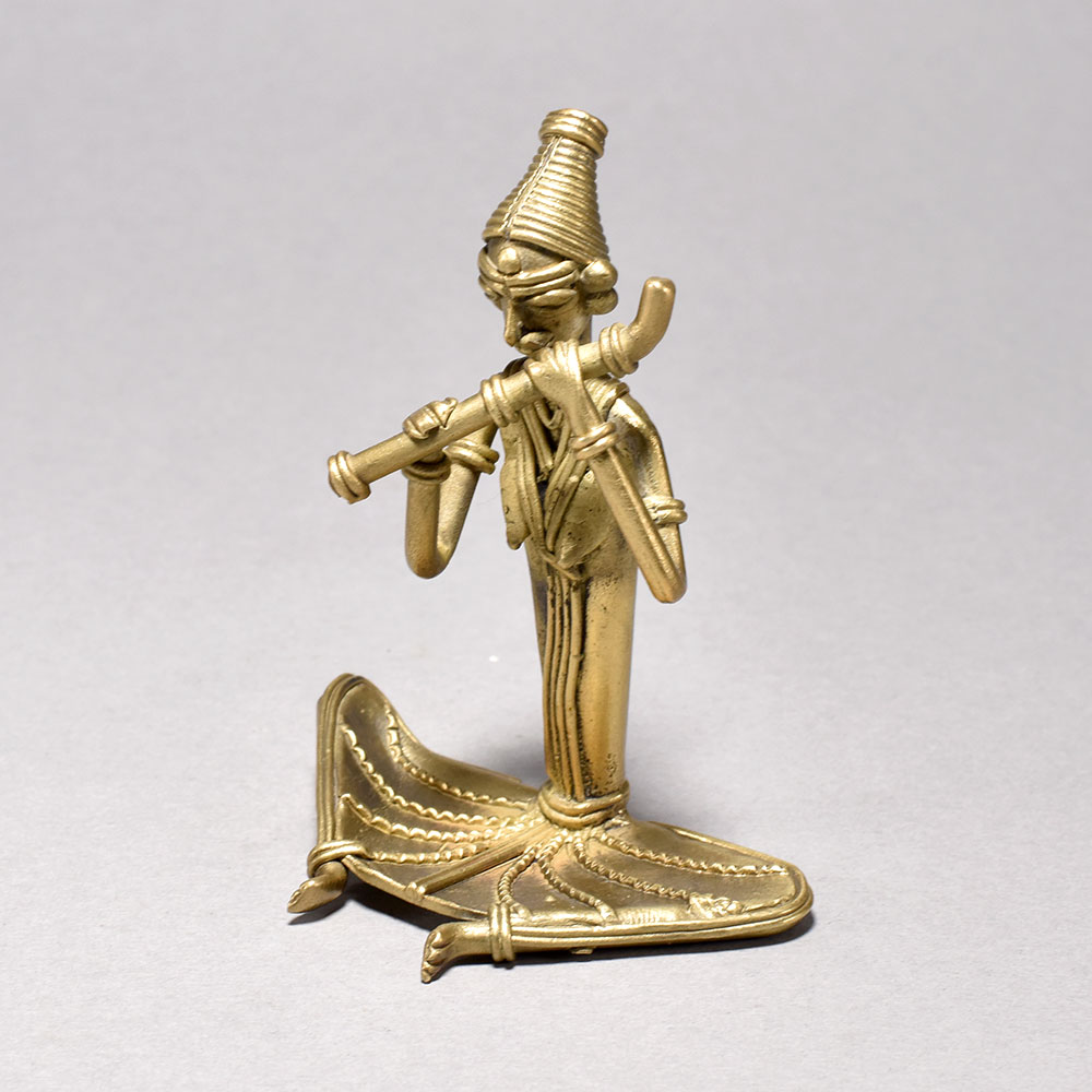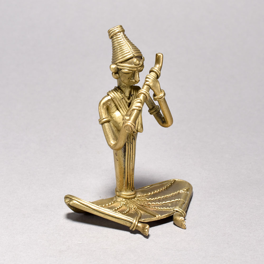 Bring the captivating rhythms of ancient tribal culture into your home with this exquisite tribal women figurine. Meticulously crafted from gleaming metal, this stunning piece depicts a woman sitting tranquilly and playing a hauntingly beautiful flute - a timeless image of the rich artistic traditions of Orissa.This tribal women figurine playing a flute is more than just a decorative piece - it's a window into a captivating world of tradition and creative expression. Display it proudly and let its soulful melodies transport you to the heart of Orissa's vibrant tribal heritage. Finely detailed metal figurine captures the serene poise of a tribal woman playing a flute This timeless piece is handcrafted by skilled artisans using time-honored techniques, ensuring each creation is truly one of a kind. Its versatile design makes it suitable for living rooms, bedrooms, offices, or meditation spaces, bringing a sense of heritage and style wherever it is displayed.