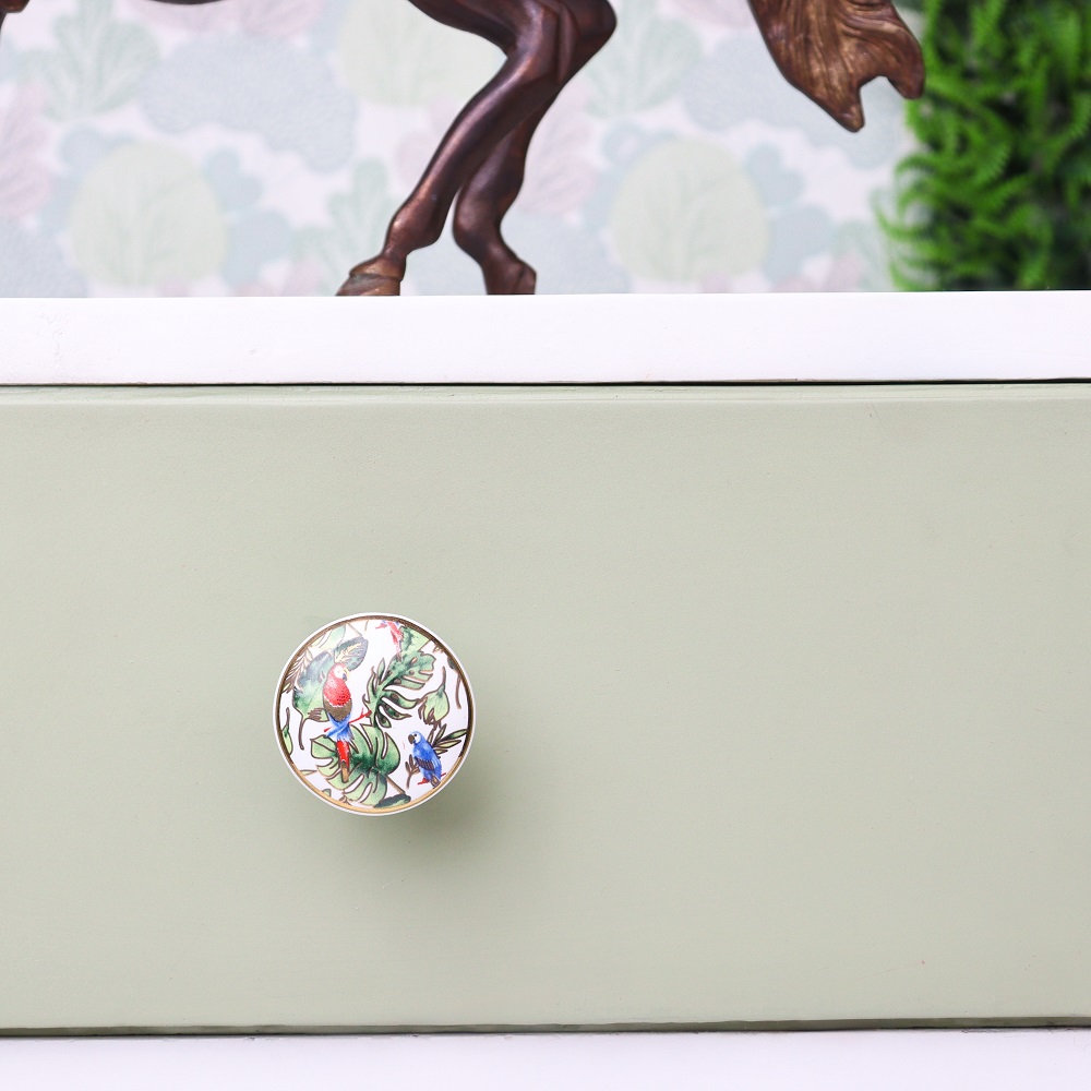 Each knob is carefully hand-painted with a lively tropical macaw bird design, capturing the essence of nature's charm. The gold detailing adds to the visual allure, giving these knobs a luxurious and polished finish. This blend of color and gold accents makes them perfect for introducing a unique and artistic touch to your home decor.