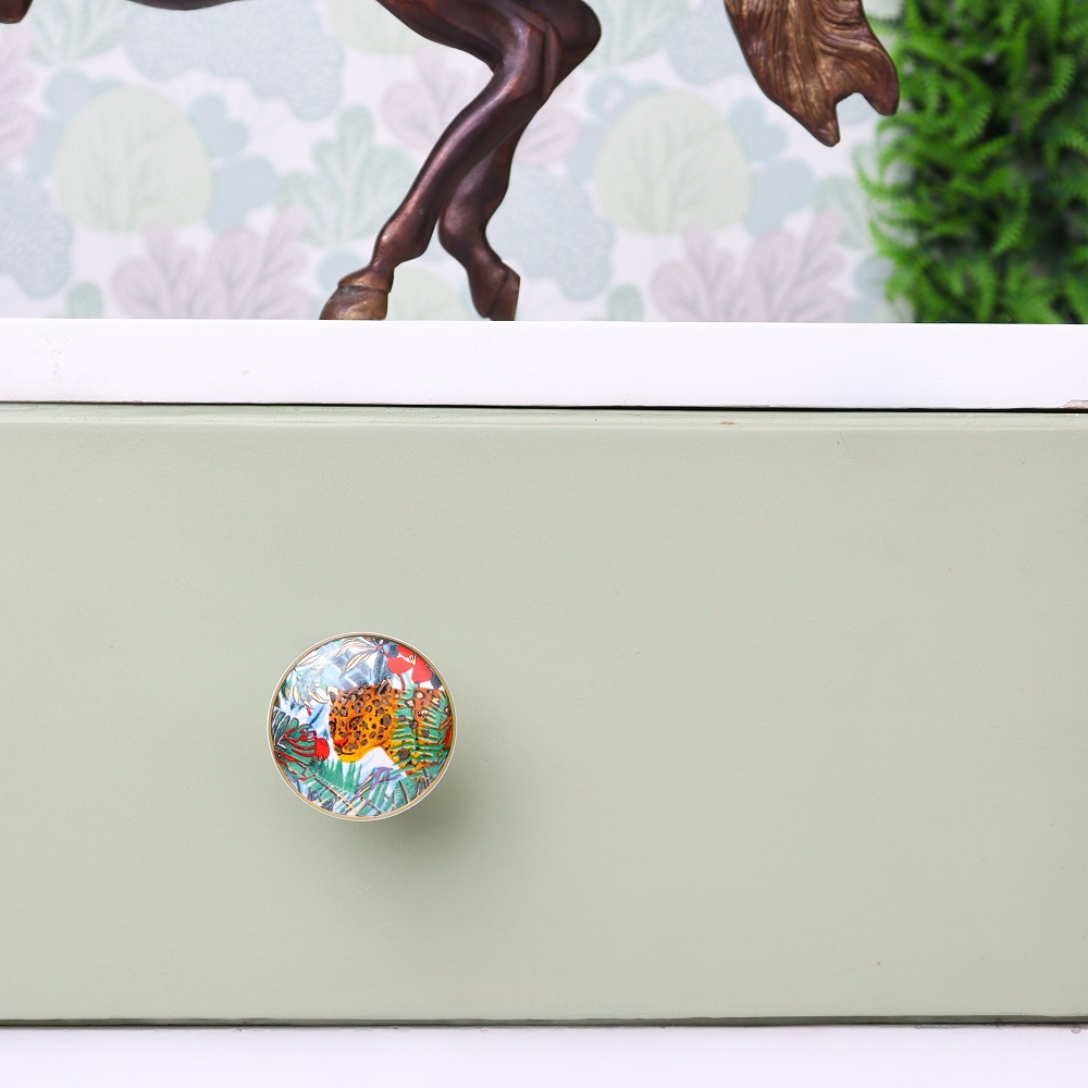 These knobs are designed to make a statement. The combination of bold animal imagery and elegant gold highlights creates a captivating visual contrast that draws attention while maintaining a refined aesthetic. The jaguar, a symbol of power and elegance, paired with tropical motifs, is perfect for those who want to add a bit of wild charm to their interiors.