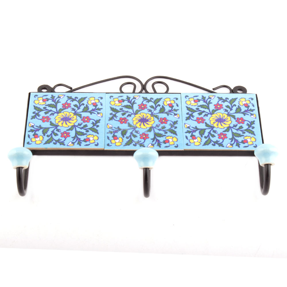 Turqoise And Yellow Wheel Flower Tiles Hooks. When Put on Wall or Cabinet it is an Art in itself. The Metal Part of this Hook is Black Powder Coated.