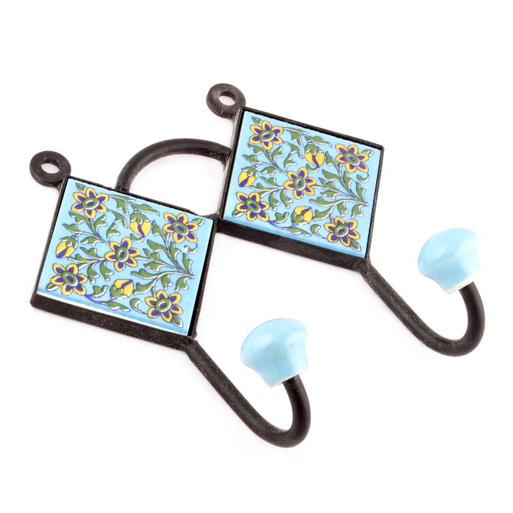 Turquoise And Navy Blue Flower Tiles Hooks. When Put on Wall or Cabinet it is an Art in itself. The Metal Part of this Hook is Black Powder Coated.