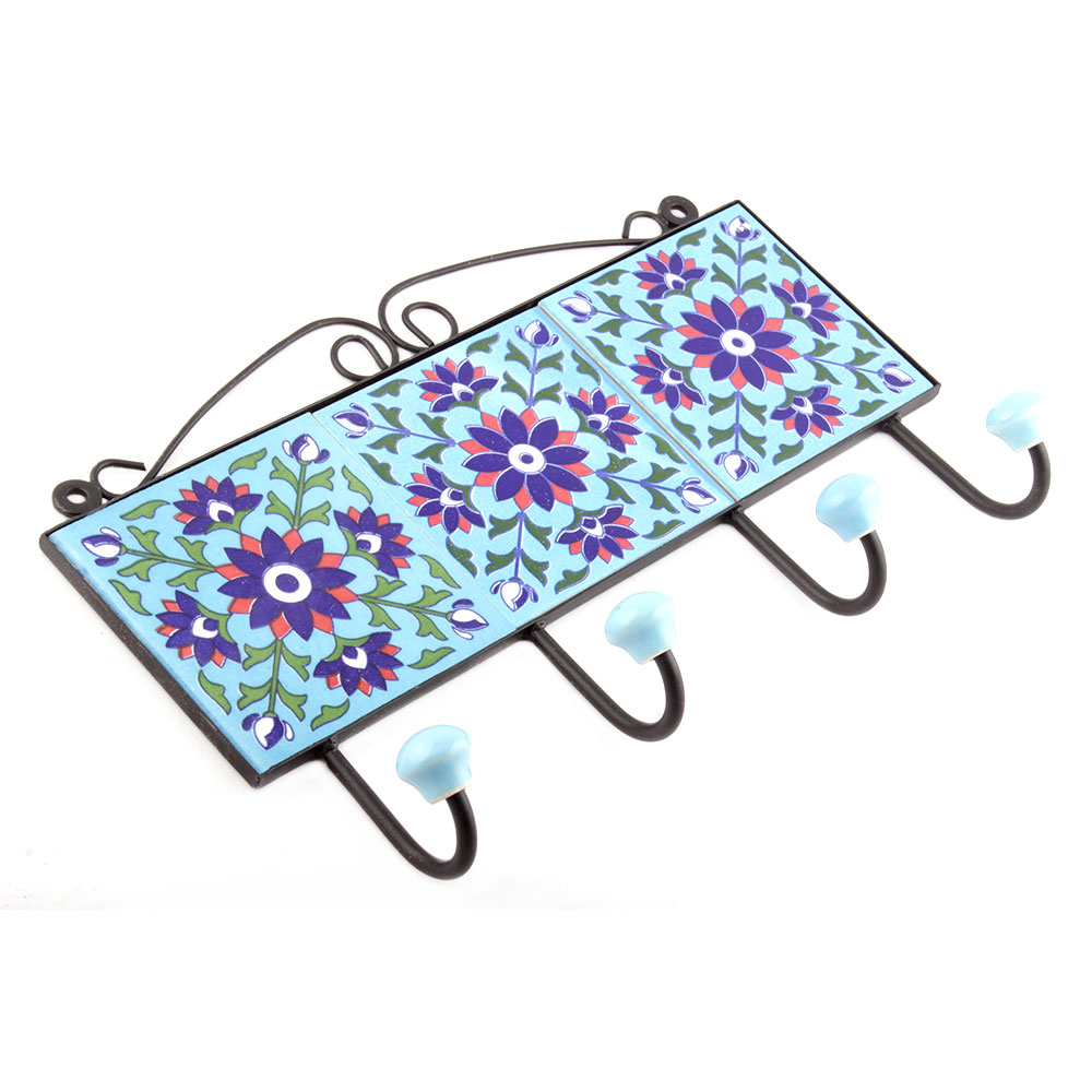 Turquoise And Navy Blue Sun Flower Tiles Hooks. When Put on Wall or Cabinet it is an Art in itself. The Metal Part of this Hook is Black Powder Coated.