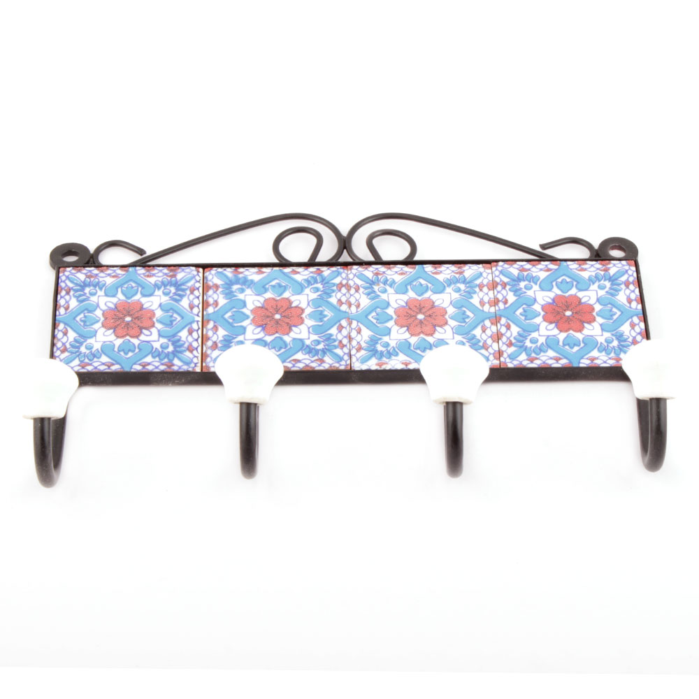Turquoise And Red Flower Ceramic Tiles Hooks. When Put on Wall or Cabinet it is an Art in itself. The Metal Part of this Hook is Black Powder Coated.