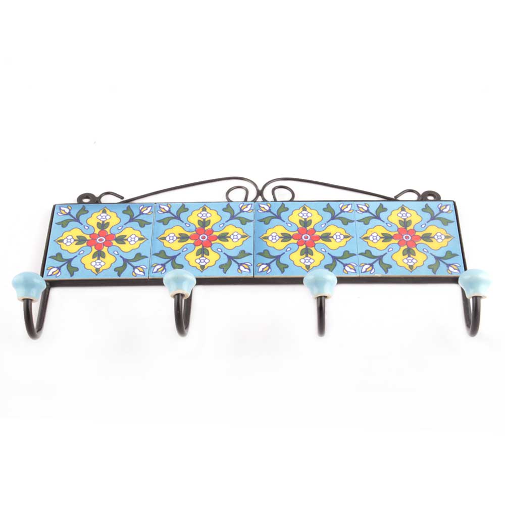 Turquoise And Red Tiny Flower Ceramic Tiles Hooks Online. When Put on Wall or Cabinet It is An Art in Itself. The Metal Part of this Hook is Black Powder Coated.