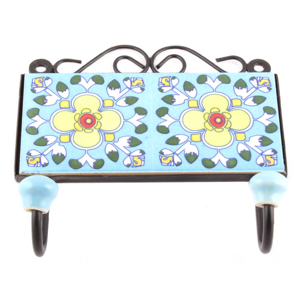 Turquoise And White Tiny Flower Ceramic Tiles Hooks. When Put on Wall or Cabinet It is An Art in Itself. The Metal Part of this Hook is Black Powder Coated.