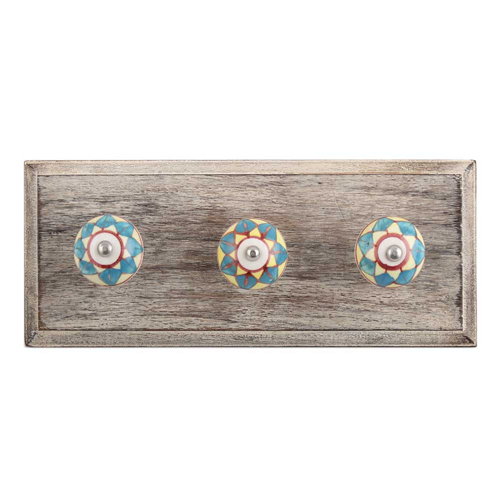 Turquoise and Yellow Ceramic Wooden Hook. A Perfect Complement to the Soft Tone of the Wood are these White Traditional Hat & Coat Hook Made of Genuine Porcelain and Brass. It can be use to Hang Jewellery, Leashes, Towels, Scarves, Light Weight Sweaters, Caps Etc.