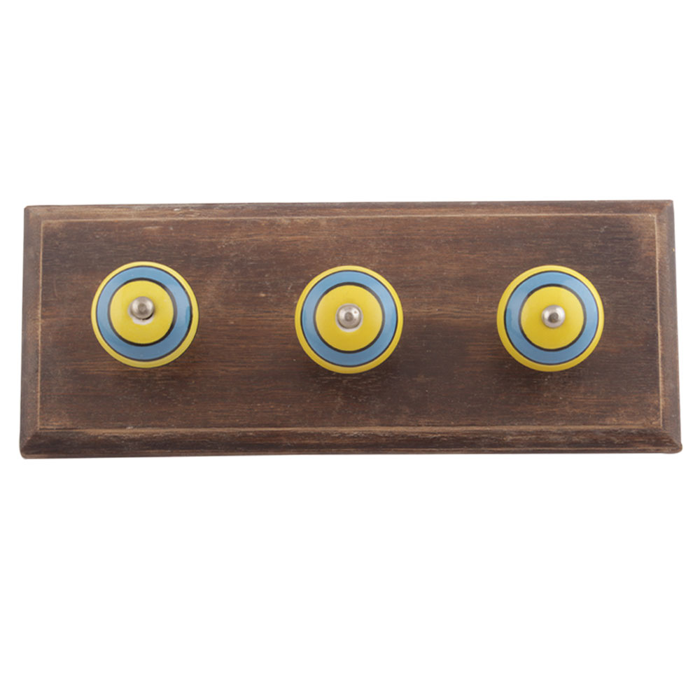 Turquoise And Yellow Striped Ceramic Wooden Hooks. A Perfect Complement to the Soft Tone of the Wood are these White Traditional Hat and Coat Hook Made of Genuine Porcelain and Brass. It can be used to Hang Jewelry, Leashes, Towels, Scarves, Light Weight Sweaters, Caps etc.