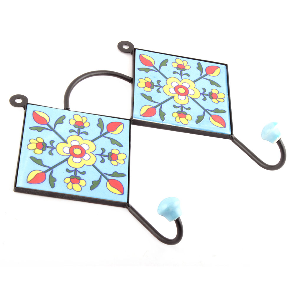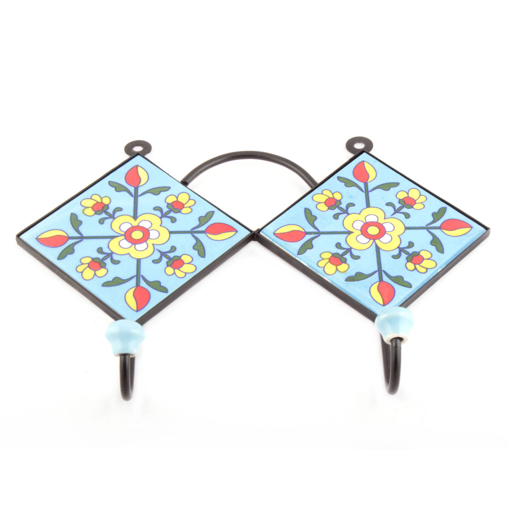 Turquoise And Yellow Tiny Floral Tiles Hooks. When Put on Wall or Cabinet it is an Art in itself. The Metal Part of this Hook is Black Powder Coated.