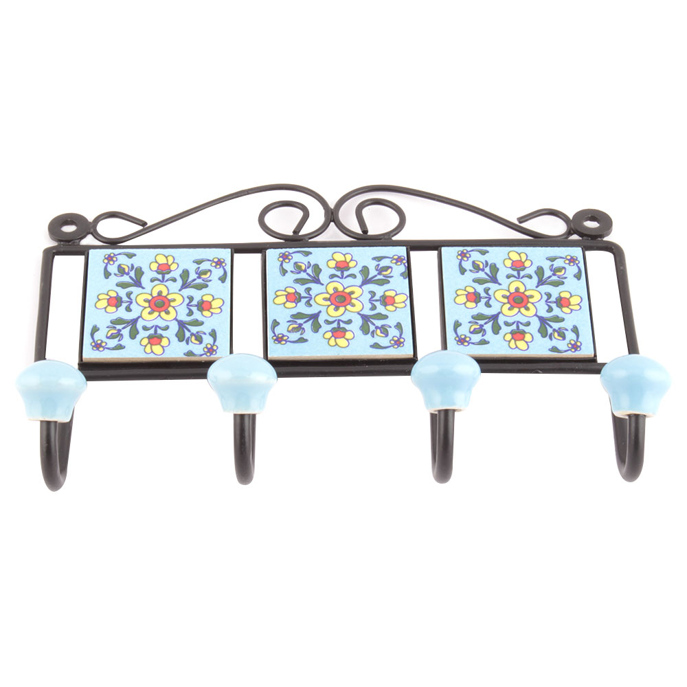 Turquoise And Yellow Tiny Flower Tiles Hooks. When Put on Wall or Cabinet it is an Art in itself. The Metal Part of this Hook is Black Powder Coated.