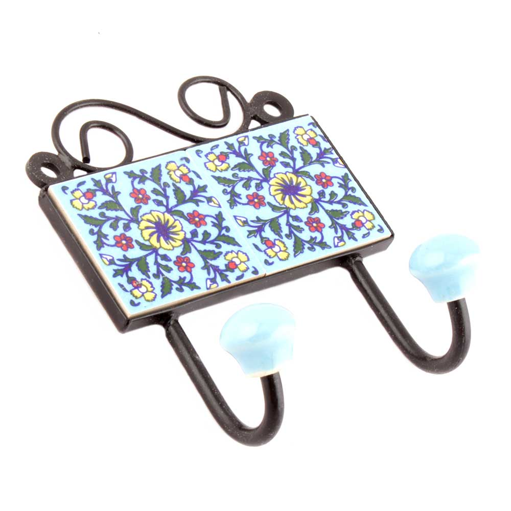 Turquoise And Yellow Wheel Flower Tiles Hooks. When Put on Wall or Cabinet it is an Art in itself. The Metal Part of this Hook is Black Powder Coated.