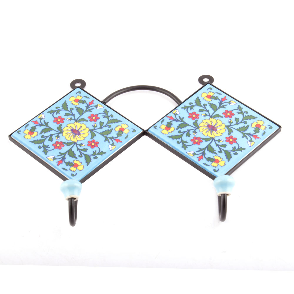Turquoise And Yellow Wheel Flower Tiles Hooks. When Put on Wall or Cabinet it is an Art in itself. The Metal Part of this Hook is Black Powder Coated.