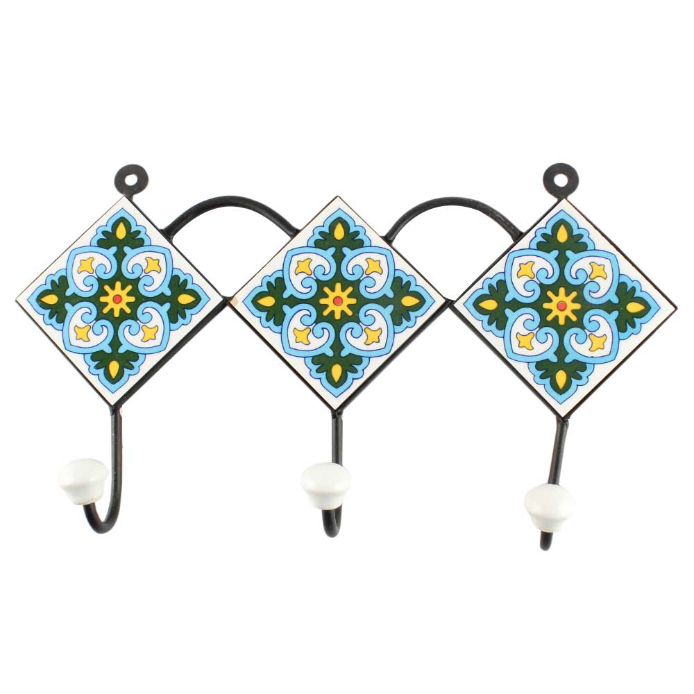 Turquoise Ceramic Floral Tile Hook. When Put on Wall or Cabinet It is An Art in Itself. The Metal Part of this Hook is Black Powder Coated.