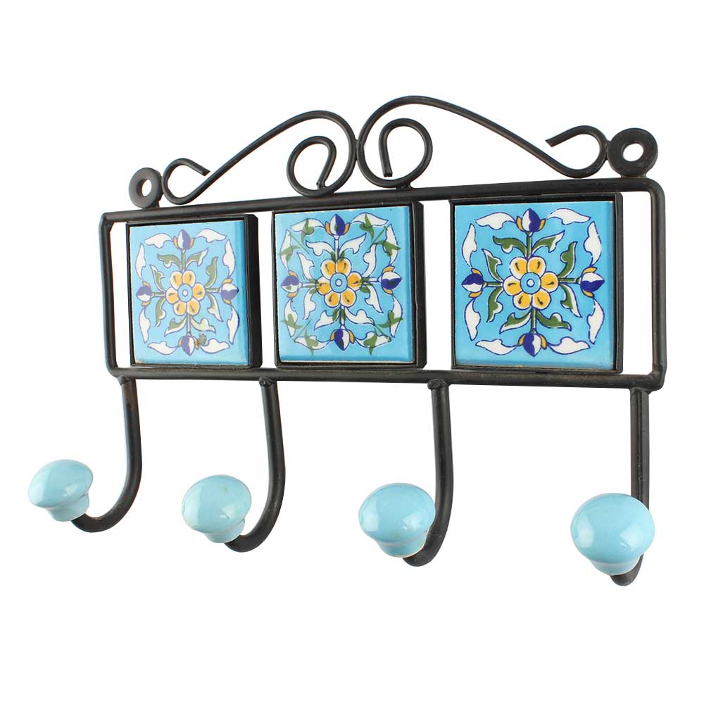 Turquoise Ceramic Floral Tiles Hook. When Put on Wall or Cabinet It is An Art in Itself. The Metal Part of this Hook is Black Powder Coated.