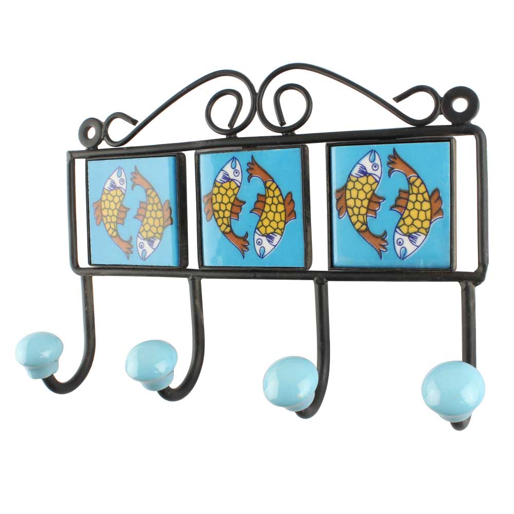 Turquoise Fish Ceramic Tiles Hook. When Put on Wall or Cabinet It is An Art in Itself. The Metal Part of this Hook is Black Powder Coated.