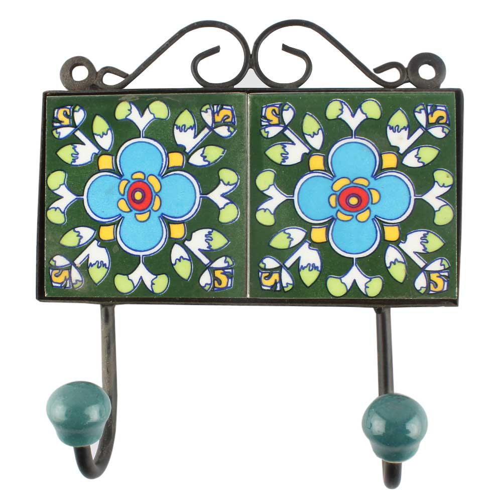 Turquoise Floral Ceramic Tile Hook. When Put on Wall or Cabinet It is An Art in Itself. The Metal Part of this Hook is Black Powder Coated.