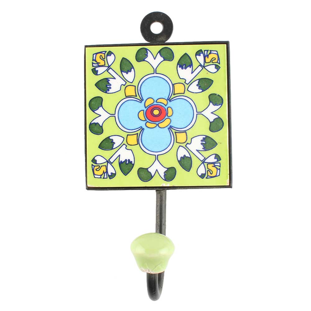 Turquoise Floral Ceramic Tile Hook. When Put on Wall or Cabinet It is An Art in Itself. The Metal Part of this Hook is Black Powder Coated.