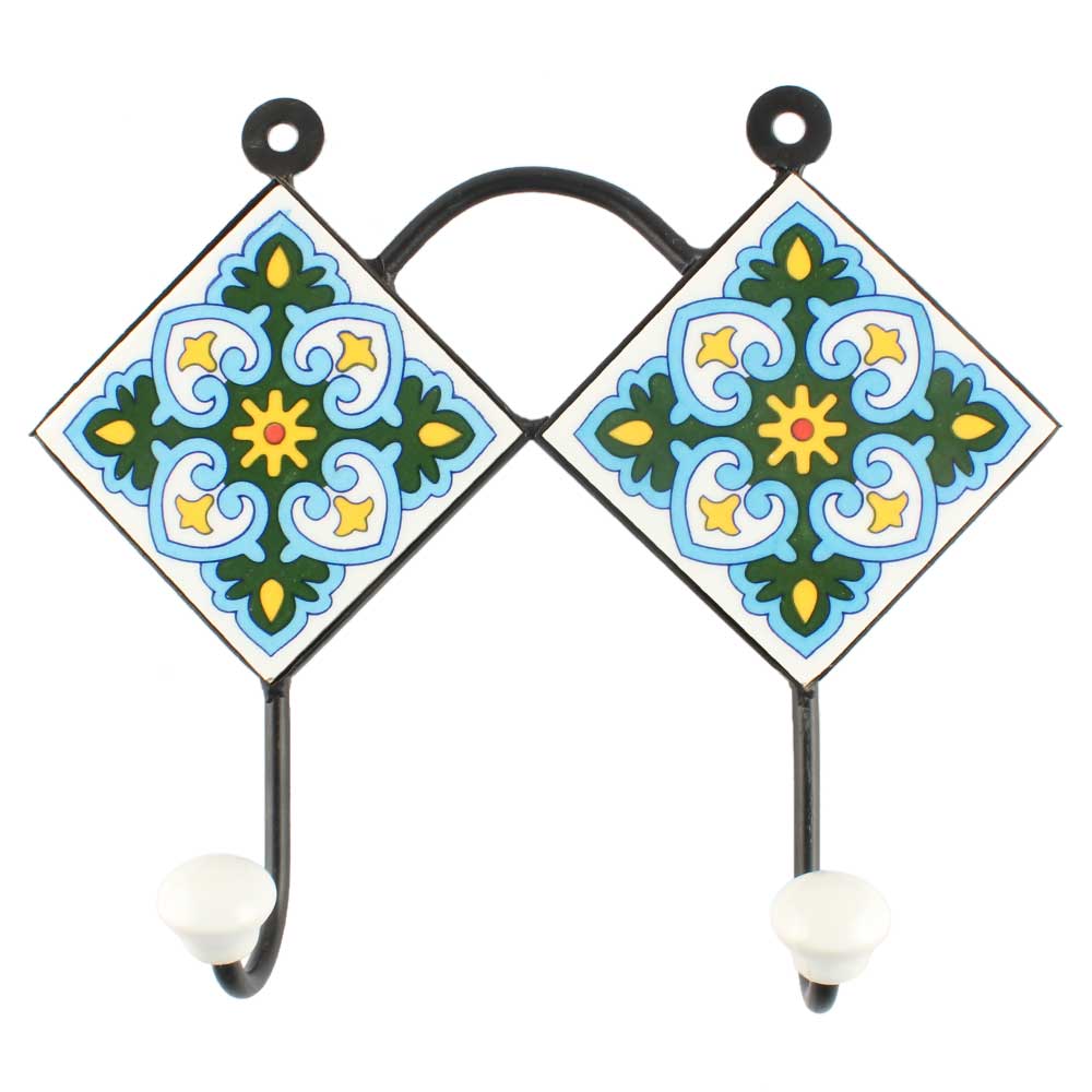 Turquoise Floral Ceramic Tile Hook. When Put on Wall or Cabinet It is An Art in Itself. The Metal Part of this Hook is Black Powder Coated.