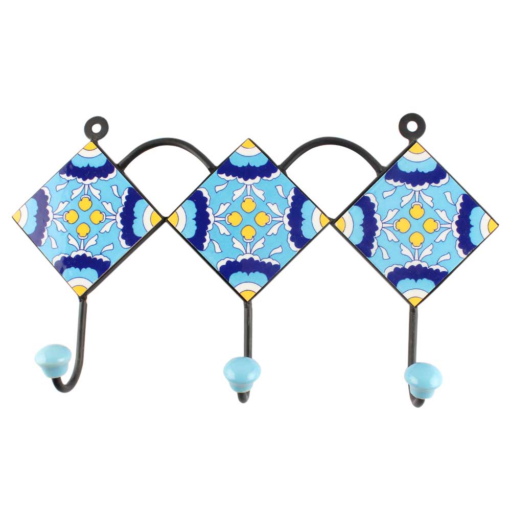 Turquoise Floral Ceramic Tile Hook Online. When Put on Wall or Cabinet It is An Art in Itself. The Metal Part of this Hook is Black Powder Coated.