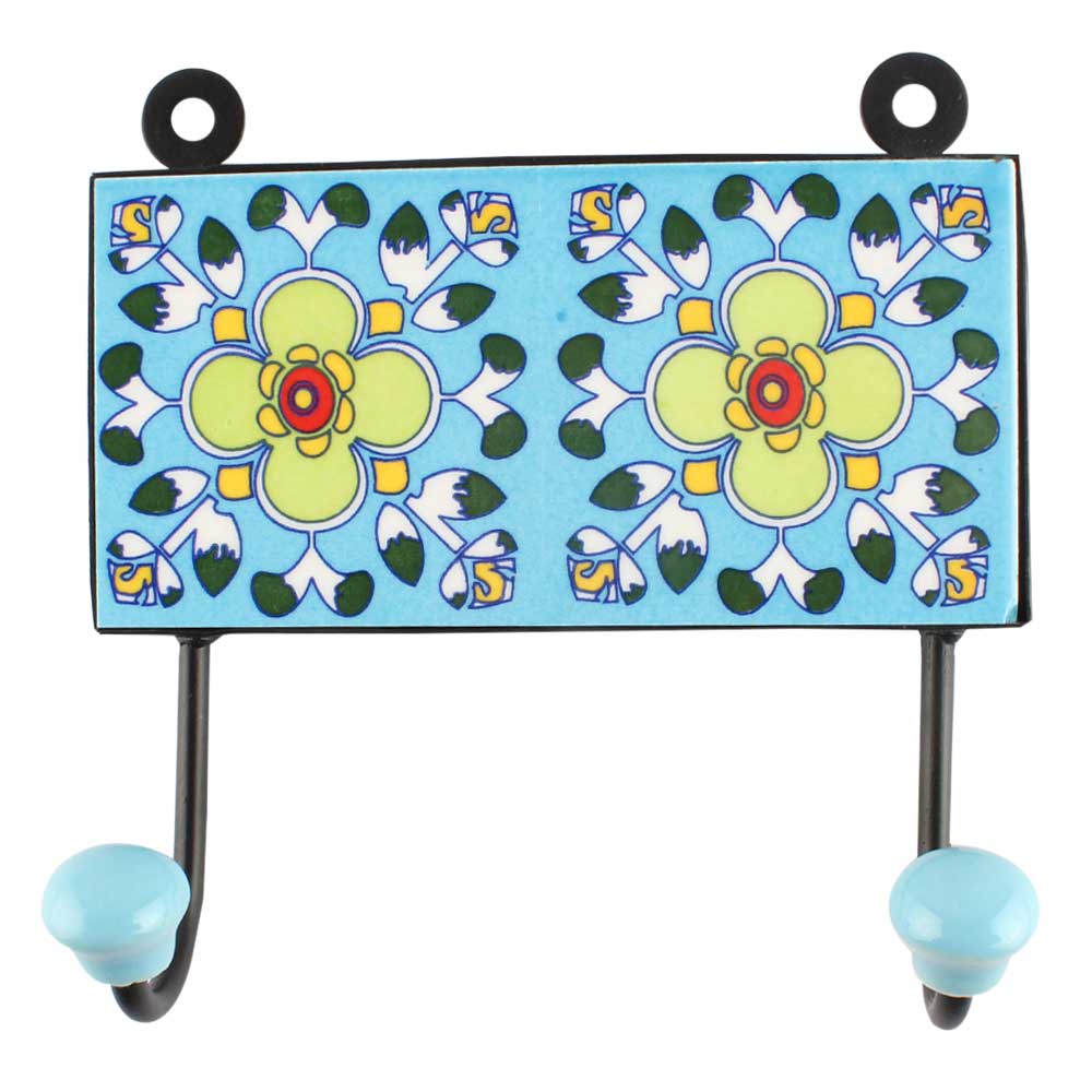 Turquoise Floral Ceramic Tile Hook Online. When Put on Wall or Cabinet It is An Art in Itself. The Metal Part of this Hook is Black Powder Coated.