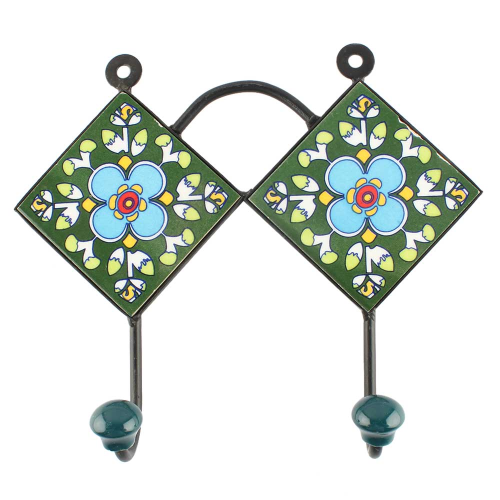 Turquoise Floral Ceramic Tile Wall Hook. When Put on Wall or Cabinet It is An Art in Itself. The Metal Part of this Hook is Black Powder Coated.