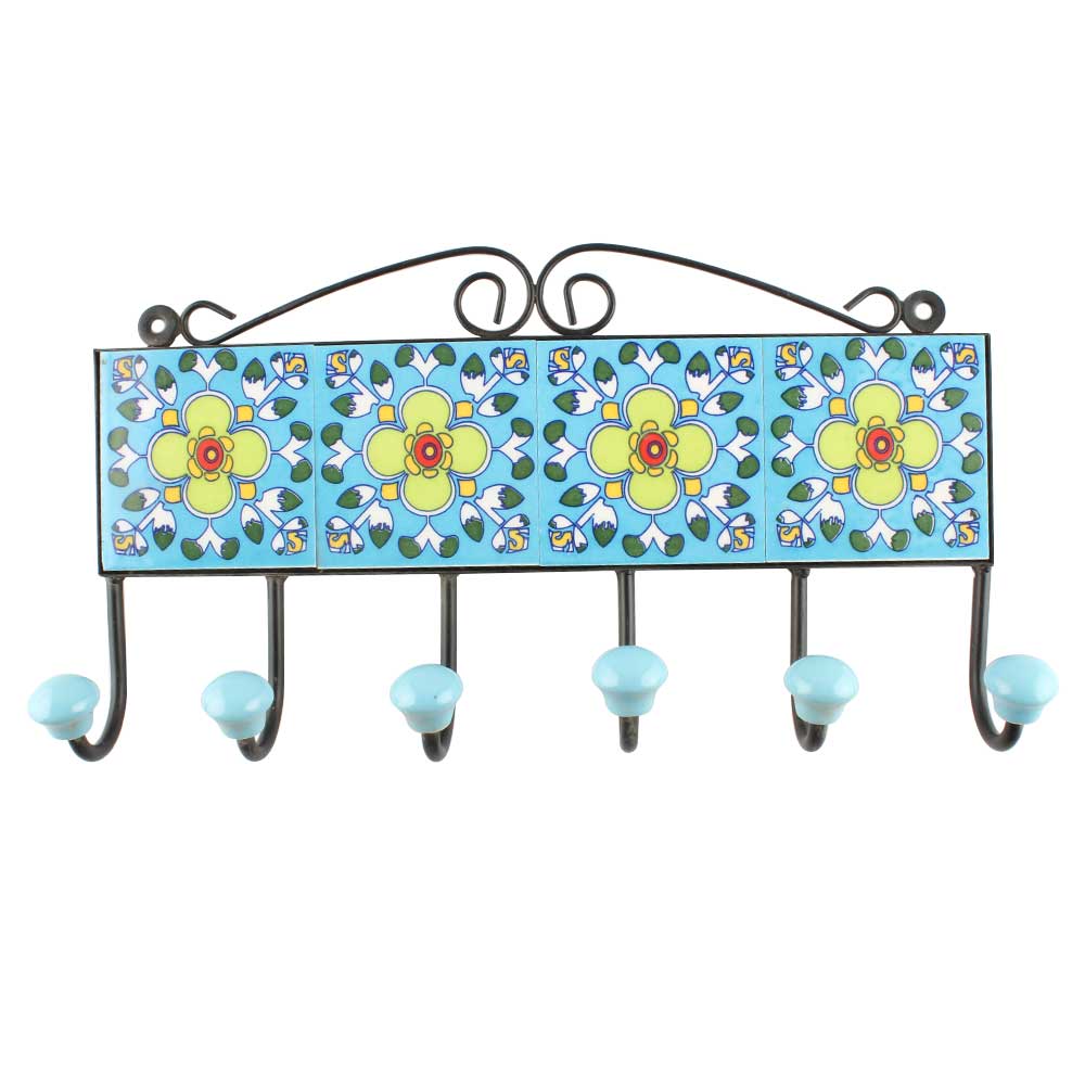 Turquoise Floral Ceramic Tiles Hook Online. When Put on Wall or Cabinet It is An Art in Itself. The Metal Part of this Hook is Black Powder Coated.