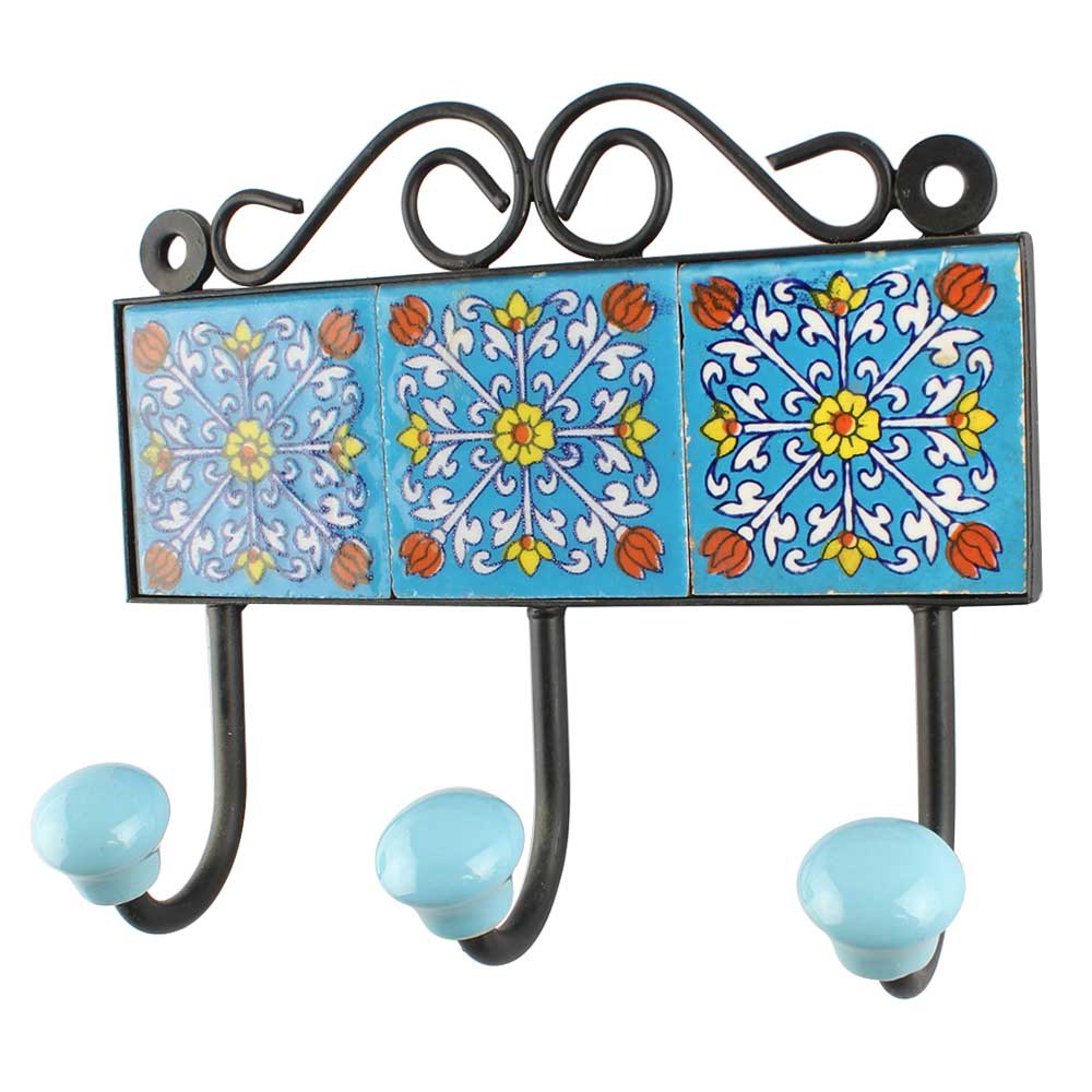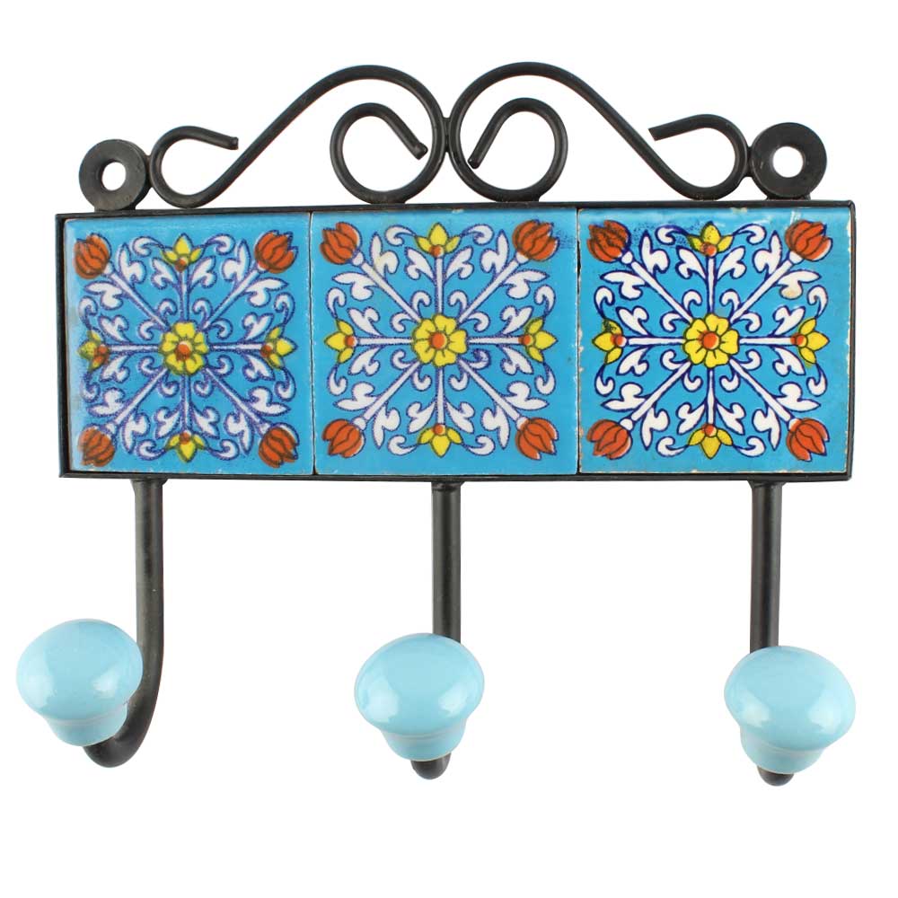 Turquoise Floral Ceramic Tiles Hook Online. When Put on Wall or Cabinet It is An Art in Itself. The Metal Part of this Hook is Black Powder Coated.