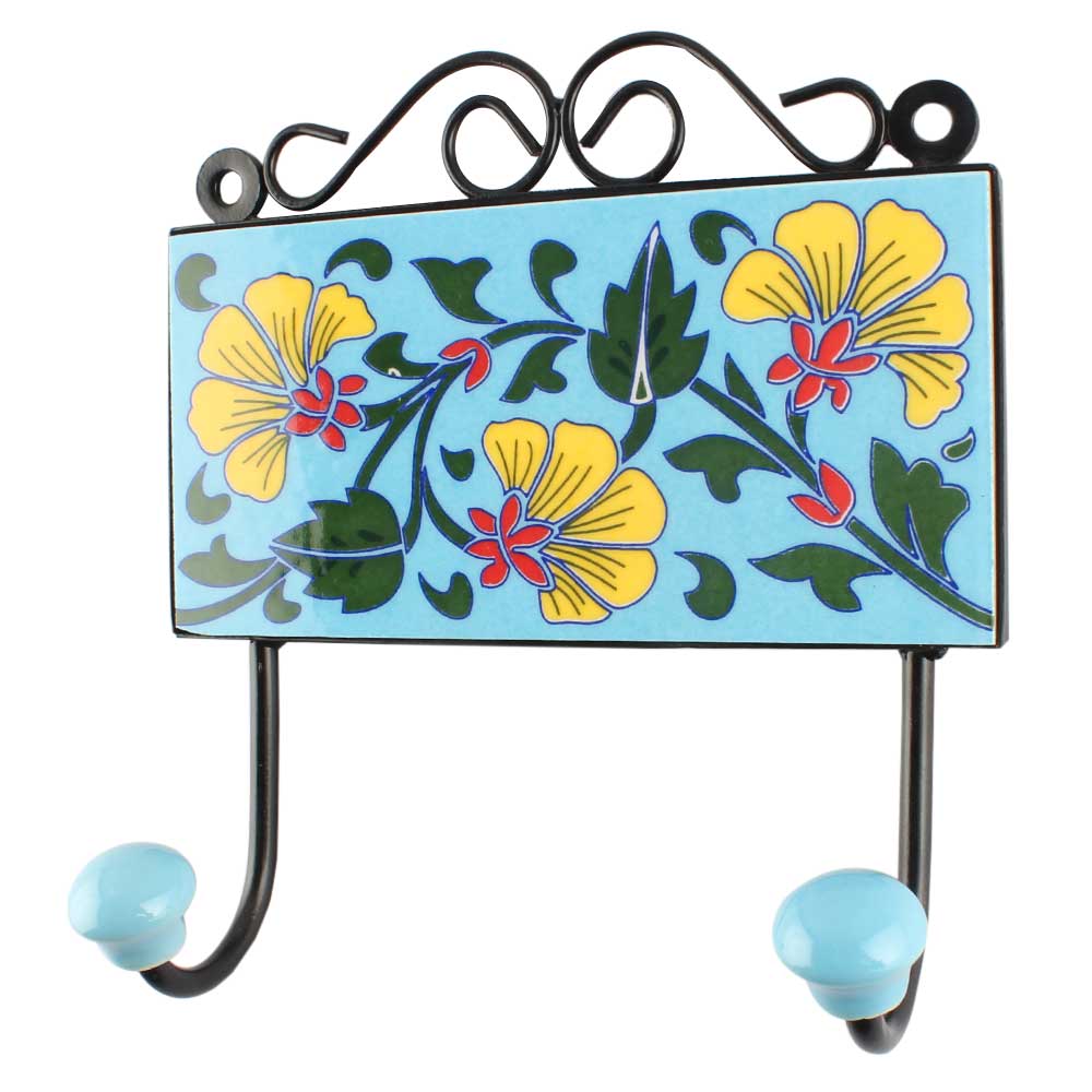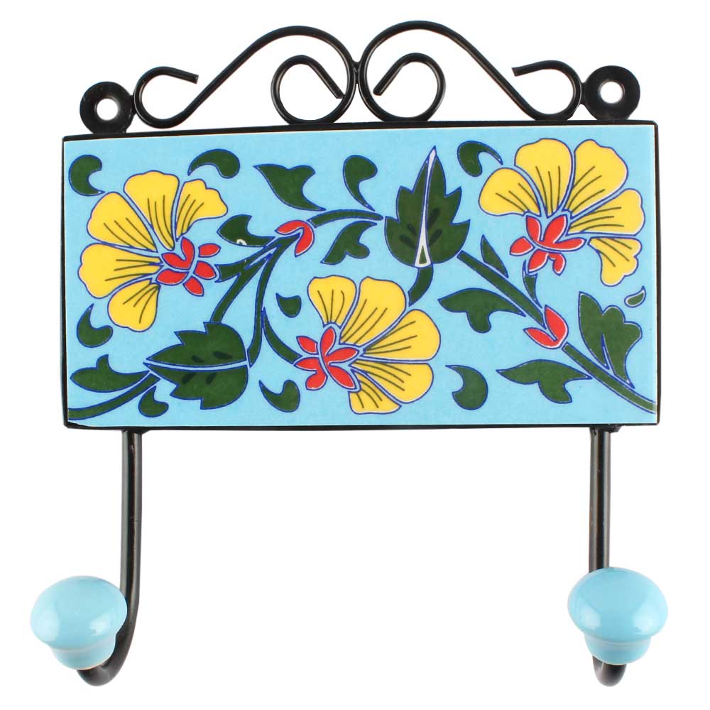 Turquoise Flower Ceramic Tile Hook. When Put on Wall or Cabinet It is An Art in Itself. The Metal Part of this Hook is Black Powder Coated.