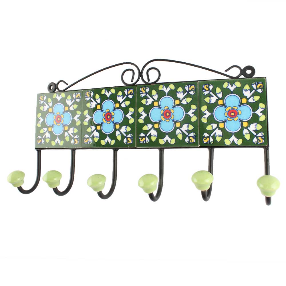 Turquoise Flower Ceramic Tile Hook. When Put on Wall or Cabinet It is An Art in Itself. The Metal Part of this Hook is Black Powder Coated.