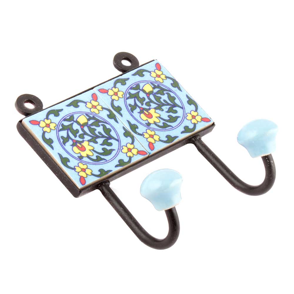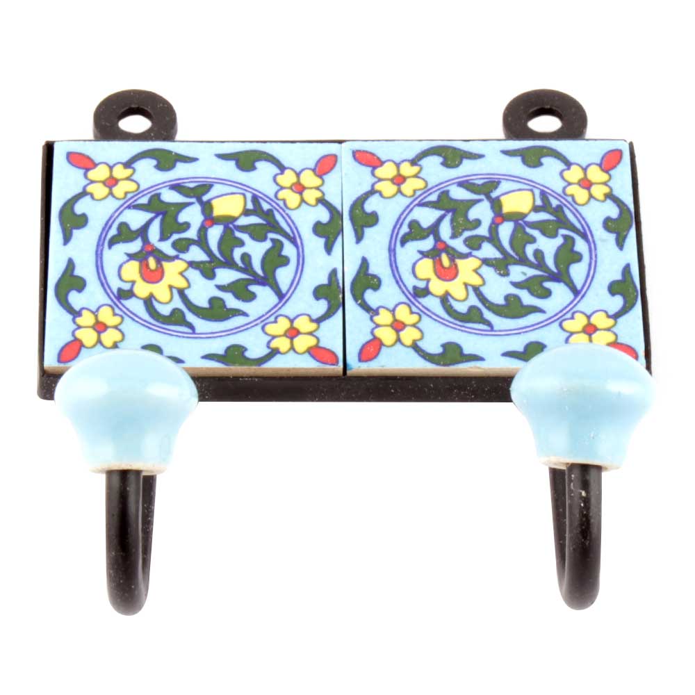 Turquoise Forest Green Floral Tiles Hooks. When Put on Wall or Cabinet it is an Art in itself. The Metal Part of this Hook is Black Powder Coated.