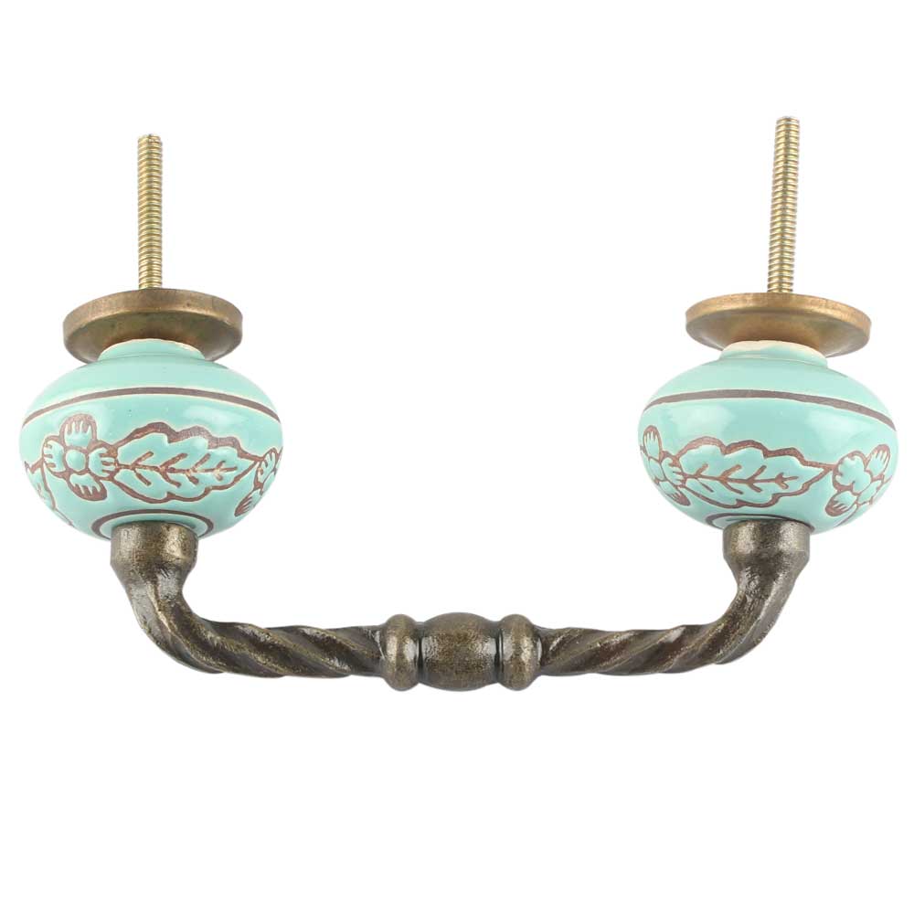 Turquoise Leaf Flower Etched Ceramic Cut Bridge Handle. Ideal for Drawer, Dresser, Cabinet, Wardrobe, Cupboard and Almirah etc.