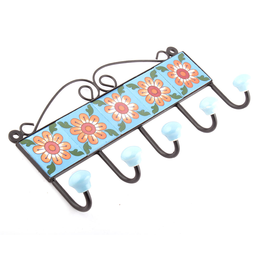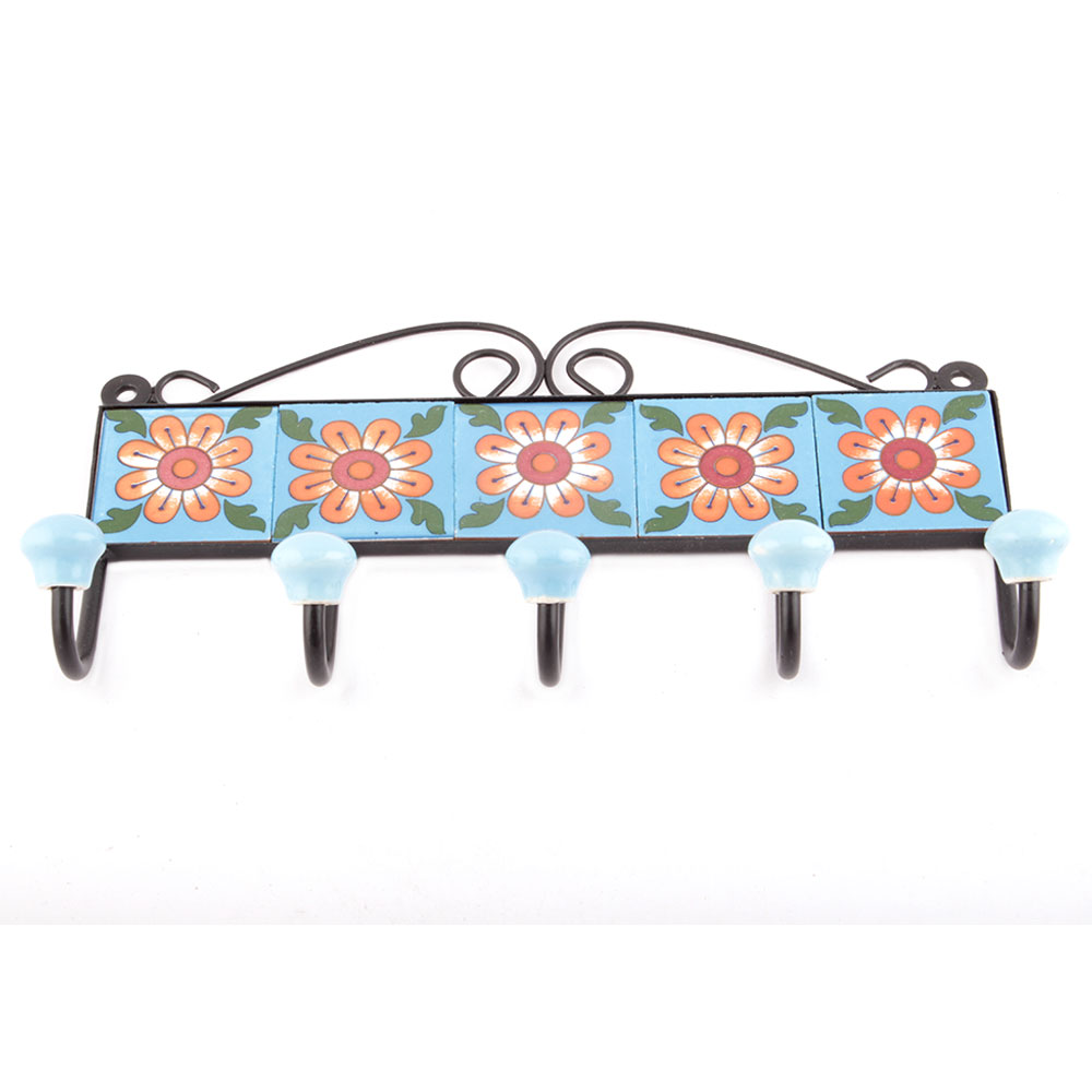 Turquoise Peach Flower Tiles Hooks. When Put on Wall or Cabinet it is an Art in itself. The Metal Part of this Hook is Black Powder Coated.