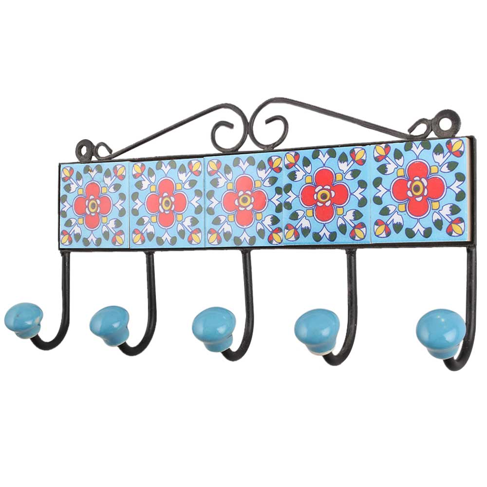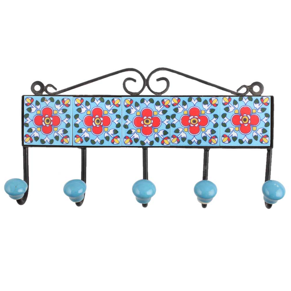 Turquoise Red Floral Tiles Hook.When put on wall or cabinet it is an art in itself. The metal part of this hook is black powder coated.